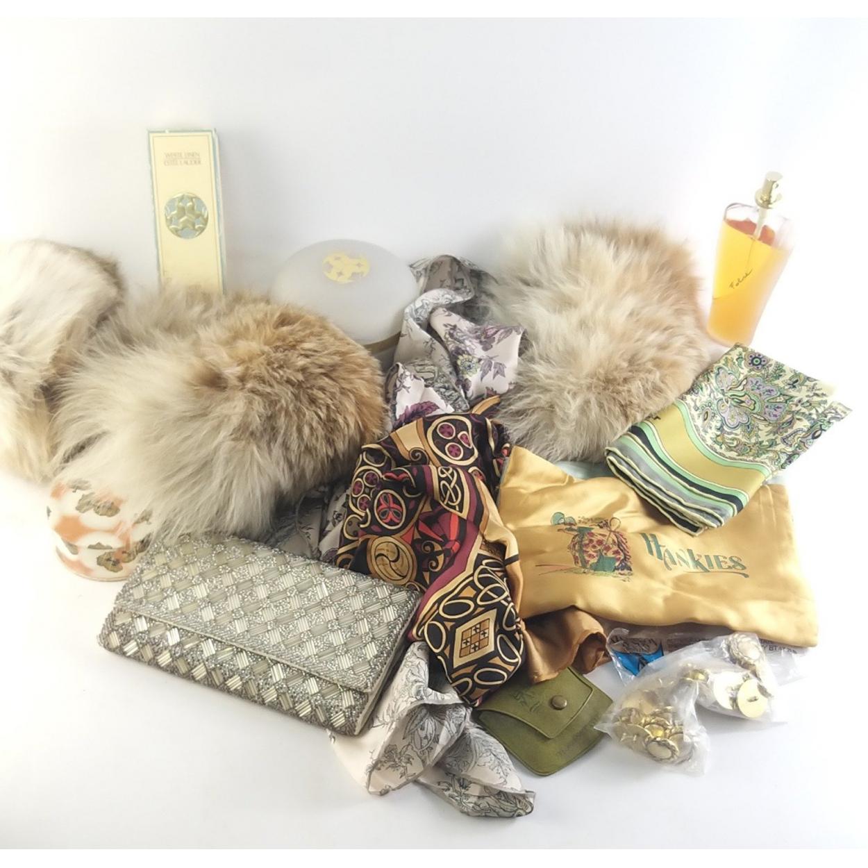 A mixed box to include evening bag, brass look buttons, head scarves, powder boxes etc
