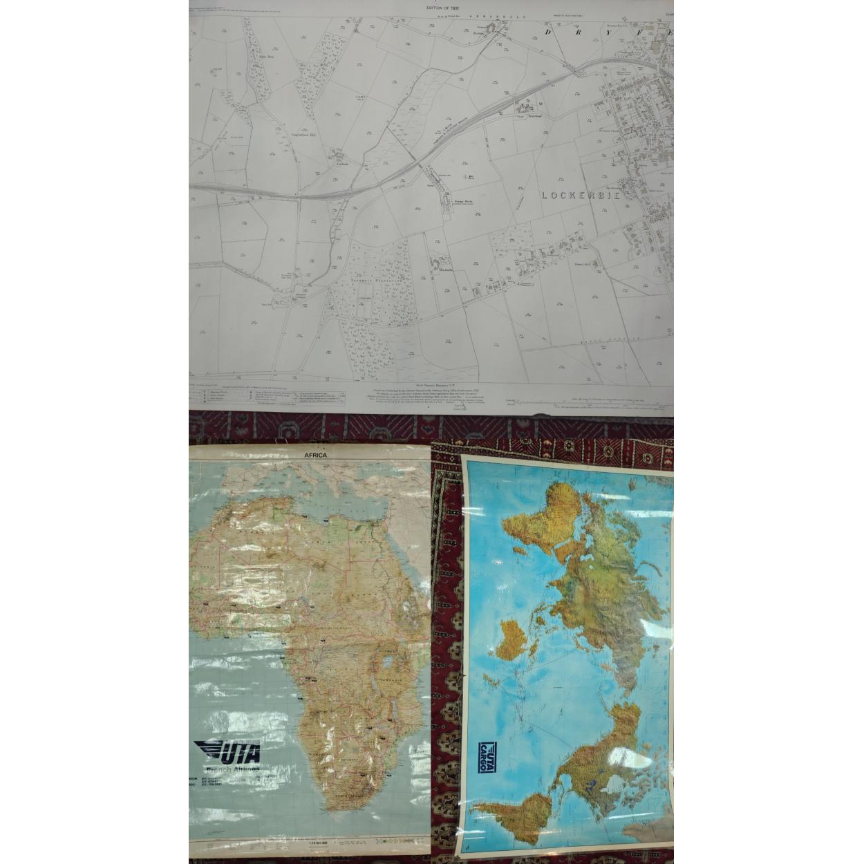 UTA French AIRLINE advertising wall maps. One a very large laminated CARGO World map 145cm x 83cm. The other of Africa. Also a 1931 Ordnance Survey map of LOCKERBIE.