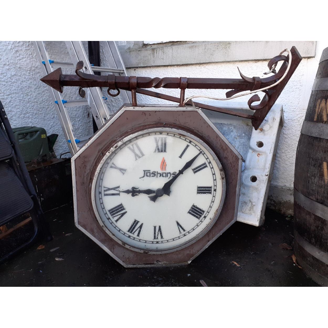 A superb large double sided vintage advertising 'Station Clock' style with heavy cast flange. Wall bracket measures 67cm tall approx excluding bracket. Glass understandably replaced with Perspex and not currently running. A great basis for either a full restoration or to simply get working to retain the superb rustic look.