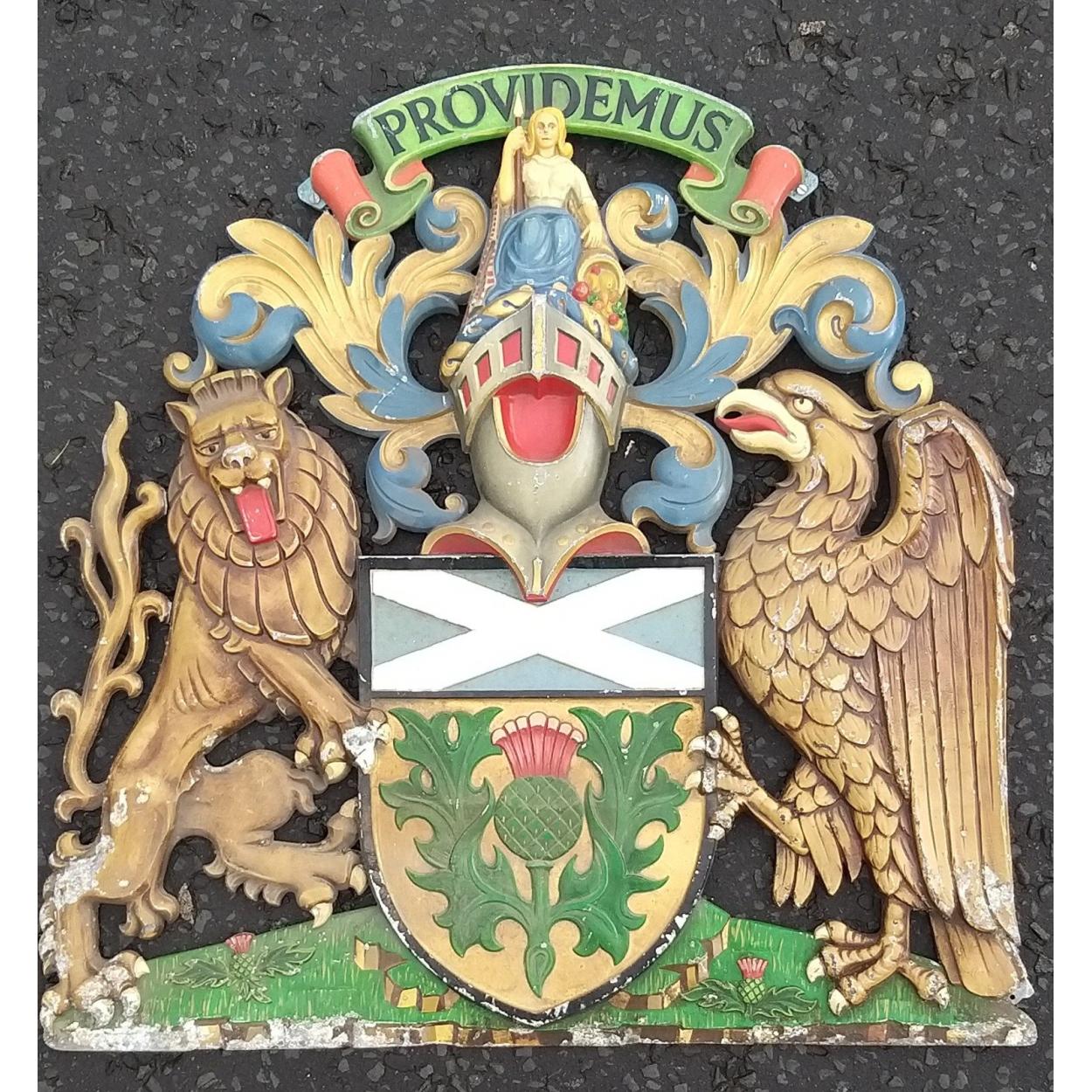 PROVIDEMUS Large cast wall plaque coat of arms with griffin and lion with saltire between. Likely a company crest? Heavy well made with highly colourful paint. 60cm wide approx.