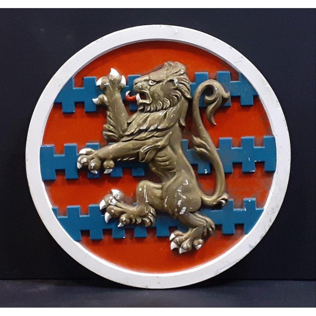 Cast iron wall plaque with Lion Rampant and crenellations. 40cm approx and a solid piece.