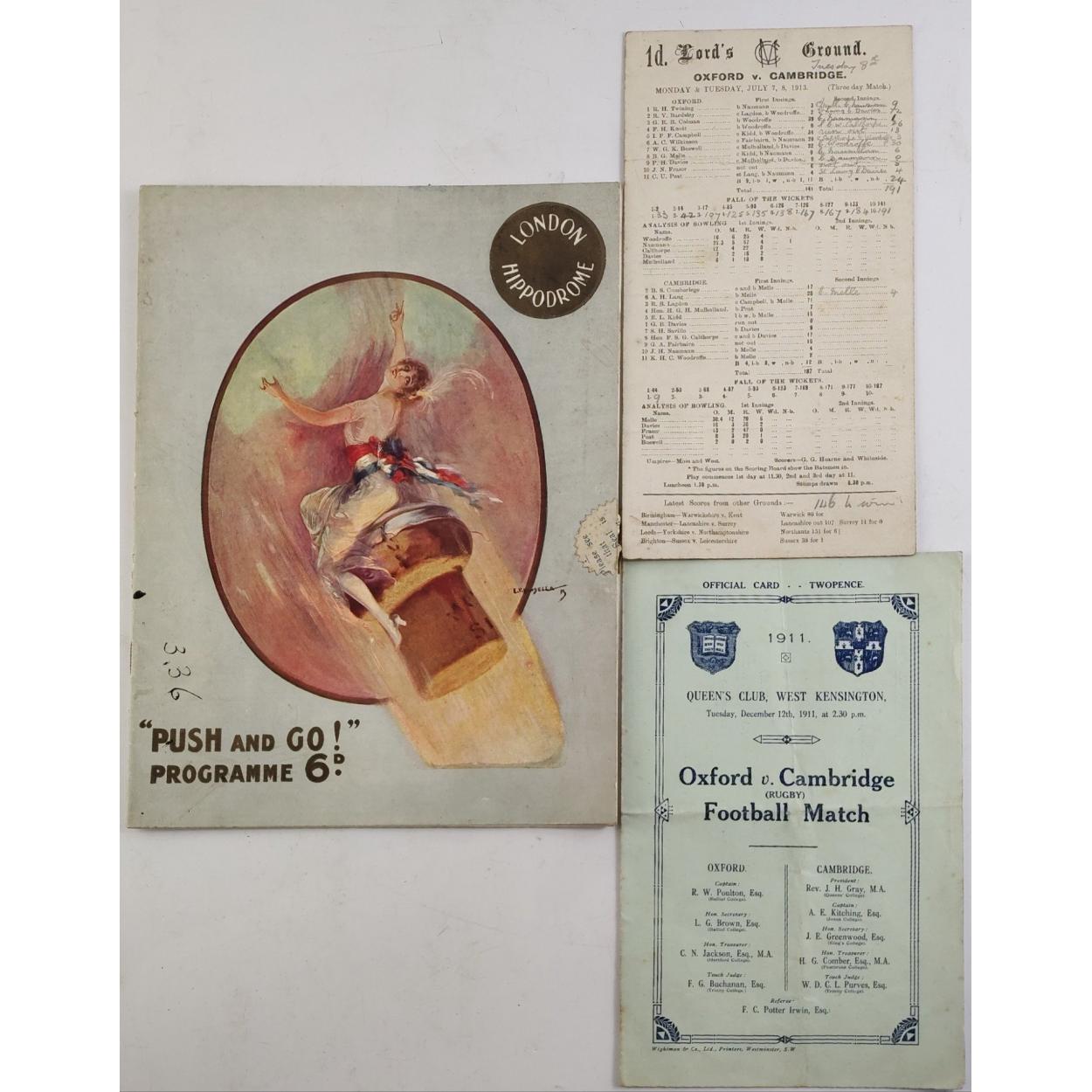 Rare ephemeral survivors to include 1911 OXFORD v. CAMBRIDGE (rugby) FOOTBALL MATCH programme, a 1913 OXFORD v CAMBRIDGE cricket programme played at Lord's with scores entered in pencil. Plus also a similarly aged programme from the LONDON HIPPODROME show ' Push and Go!