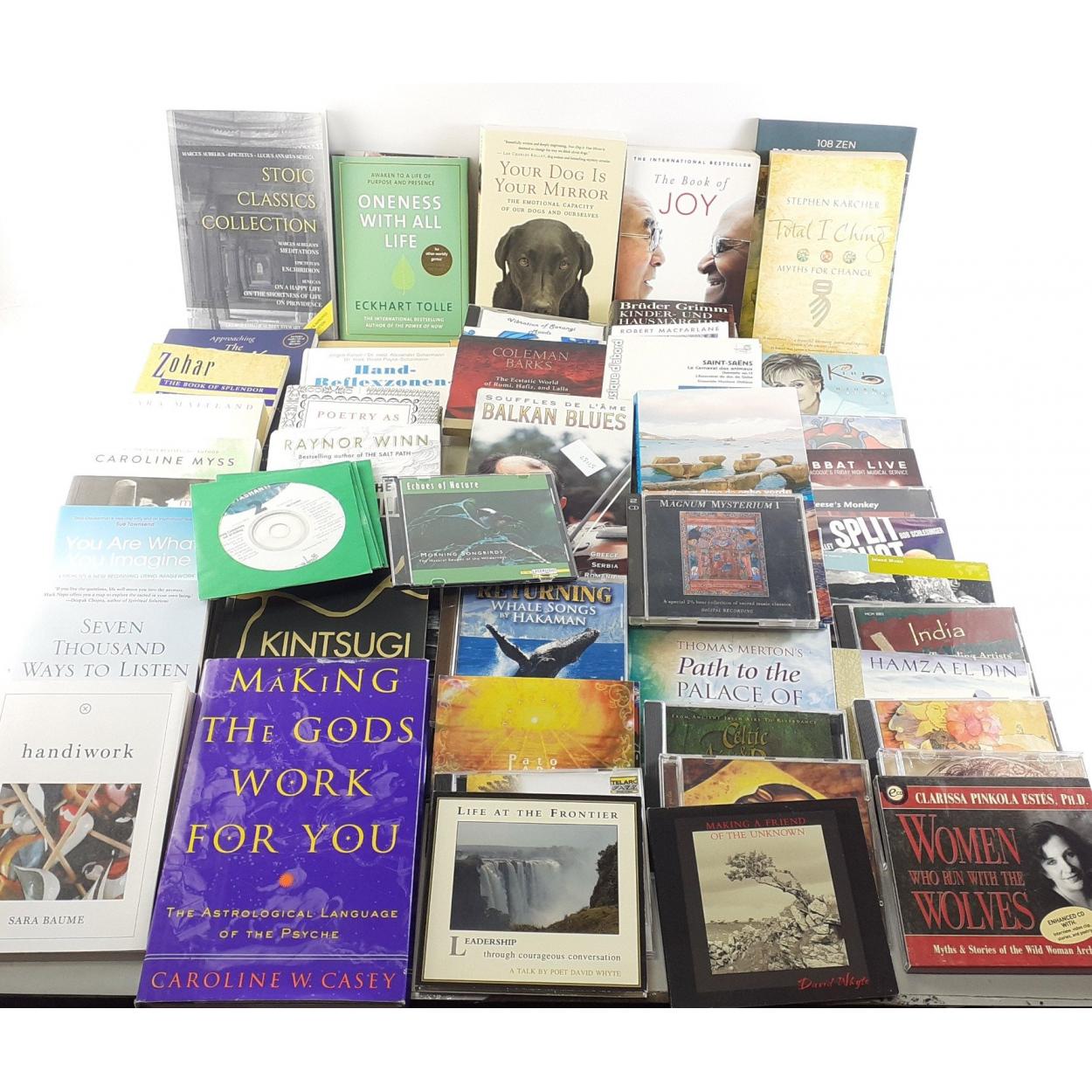 An assorted collection of New Age books, audio books and music, including Caroline Myss, Clarissa Pinkola Estes, Raynor Winn, Dalai Lama, Thomas Merton etc., and CDs to include old and new world music selections, David Whyte, Nature Sounds etc.