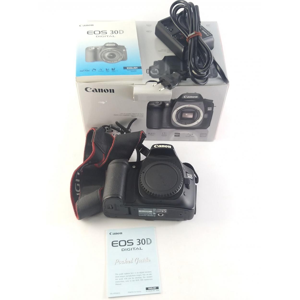 A boxed CANON 30D with Canon battery, charger plus cable (non-UK), manual. Excellent condition