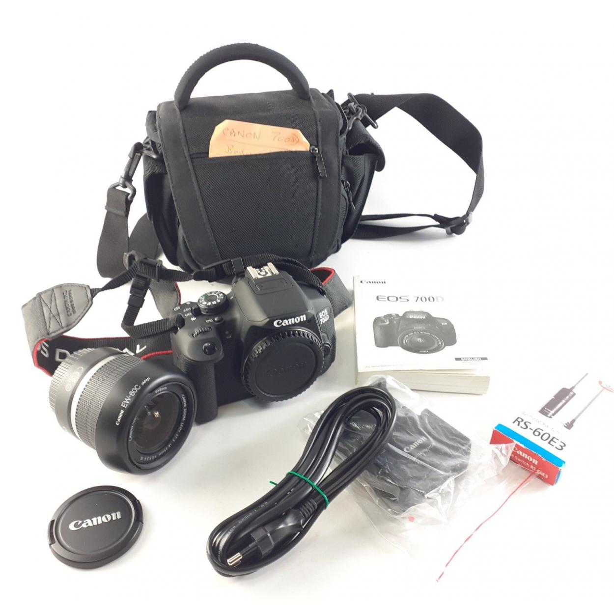A CANON 700D camera in carry case with Canon battery, 2 others, charger and cable, 18-55mm F/3.5-2 -5.6 lens, remote release, manual. Excellent condition with no dust.