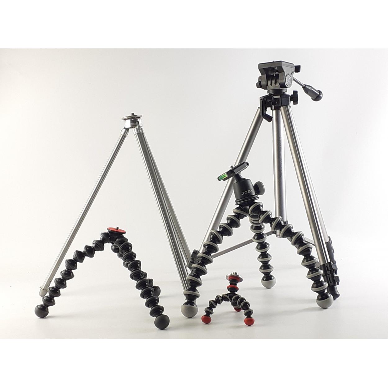 Three JOBY GorillaPod tripods, - 30cm with ball head, 20cm and 10cm, a BILORA extendable tripod, a MIRANDA TITAN 202 with adjustable head