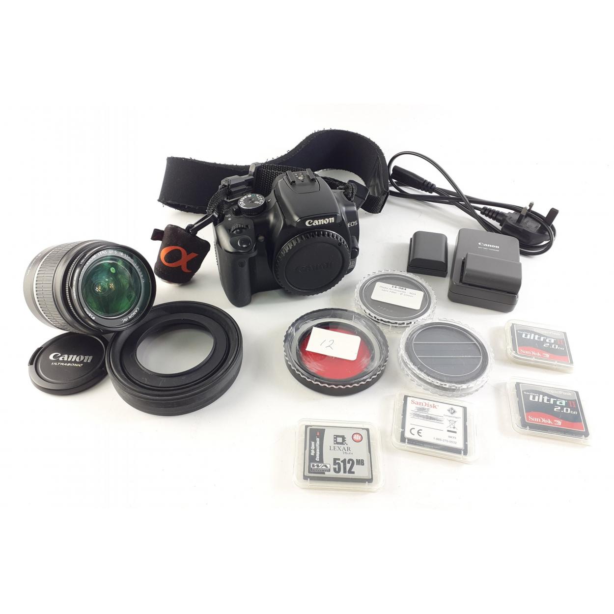 CANON EOS 400D camera with 18-55mm lens CANON 18-55 mm Zoom lens and caps. Charger cable, rubber hood, and some accessories. Lenses and mirror appear in good clean condition.