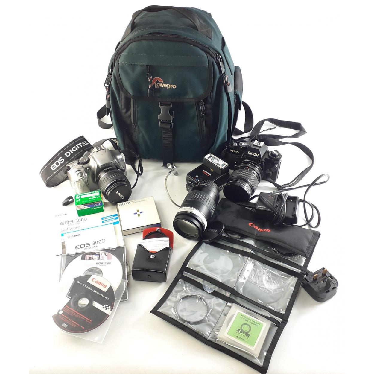 A CANON EOS 300D camera with cables, manual, a CANON 90-300mm lens and an EFS18-55mm lens. Plus a RICOH KR-10 camera, plus a selection of filters, all within a LOWPRO camera bag. Wear to Canon camera grip.