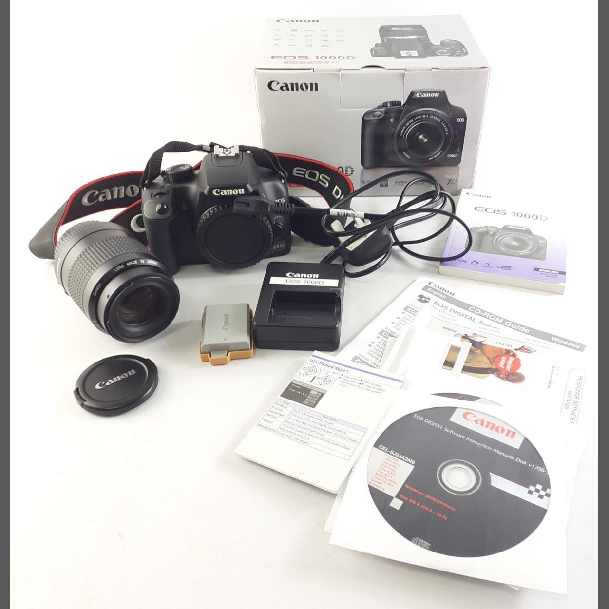 A CANON 1000D camera with 80-200 lens, batteries, charger, cable and manual in box. Excellent condition.