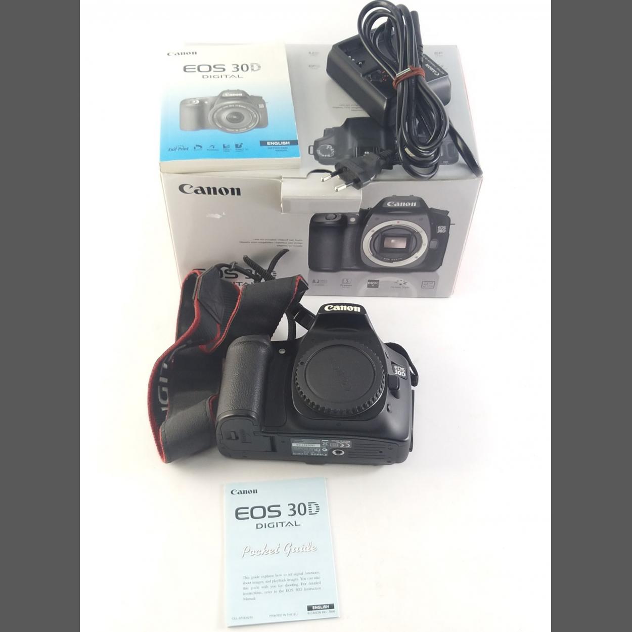 A boxed CANON 30D with Canon battery, charger plus cable (non-UK), manual. Excellent condition