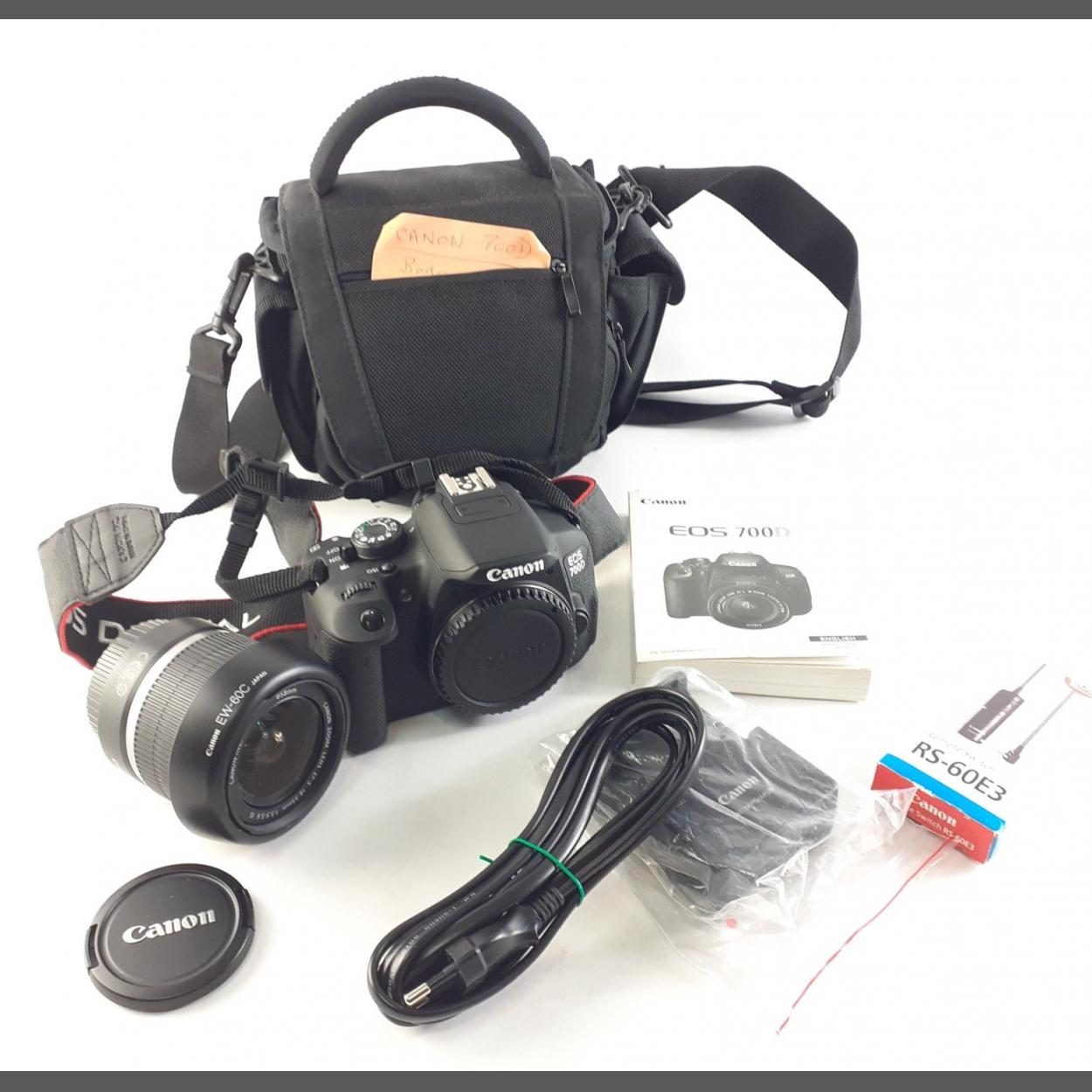 A CANON 700D camera in carry case with Canon battery, 2 others, charger and cable, 18-55mm F/3.5-2 -5.6 lens, remote release, manual. Excellent condition with no dust.