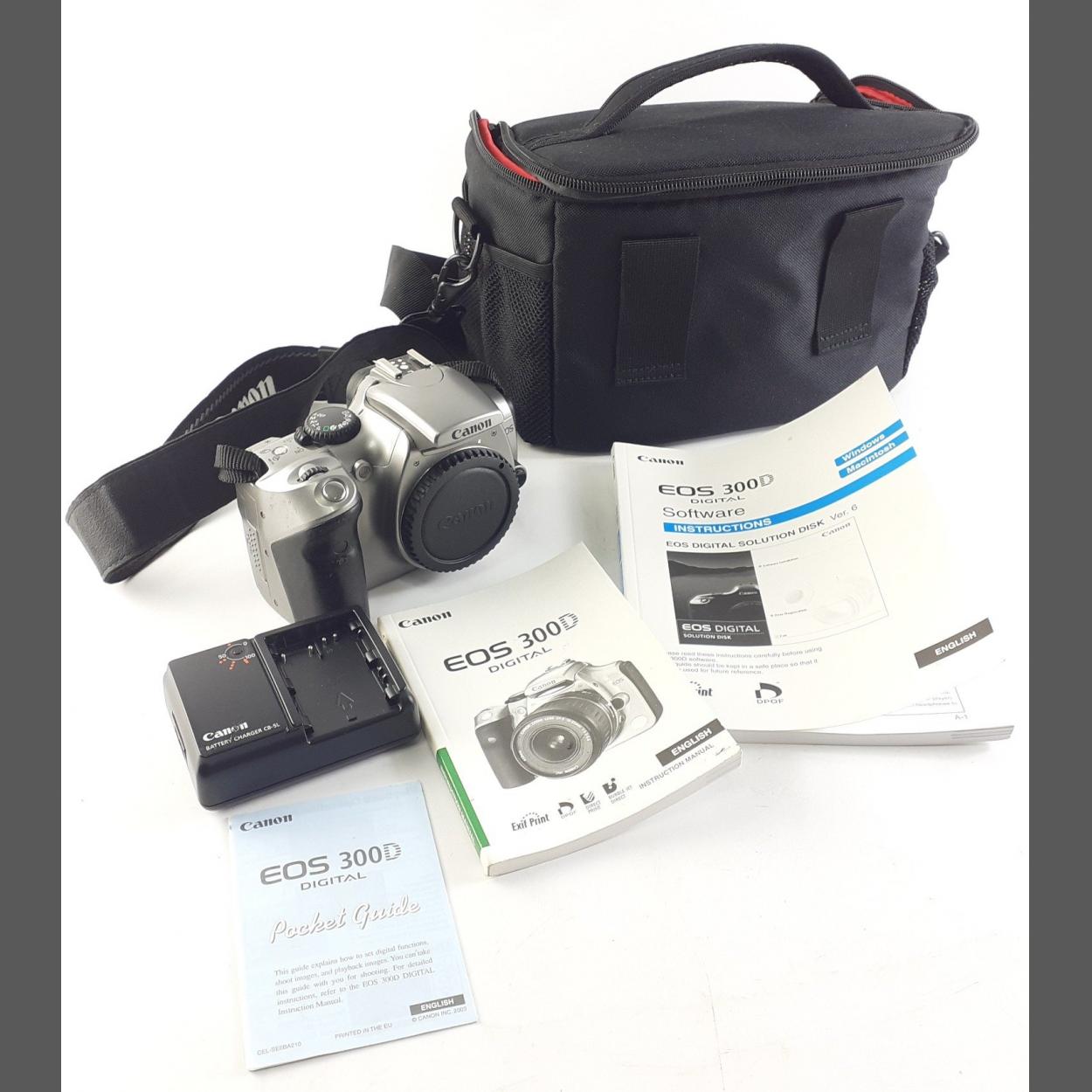 A CANON 300D camera in carry case with batteries CANON and JESSOPS, charger, 2 manuals. Wear to camera grip.