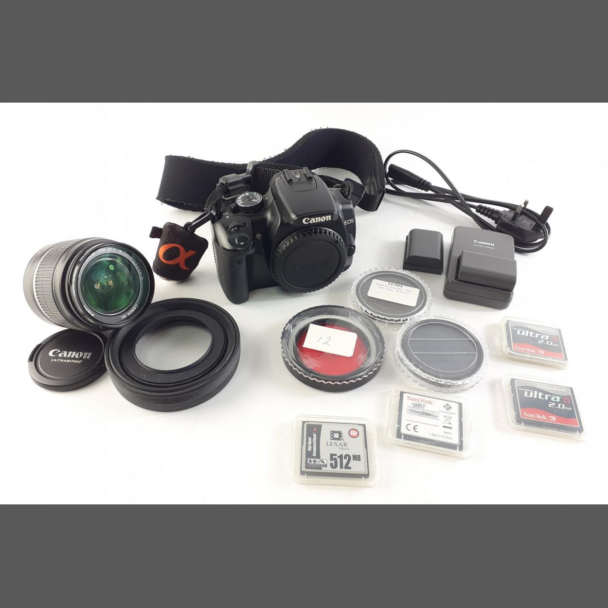 CANON EOS 400D camera with 18-55mm lens CANON 18-55 mm Zoom lens and caps. Charger cable, rubber hood, and some accessories. Lenses and mirror appear in good clean condition.