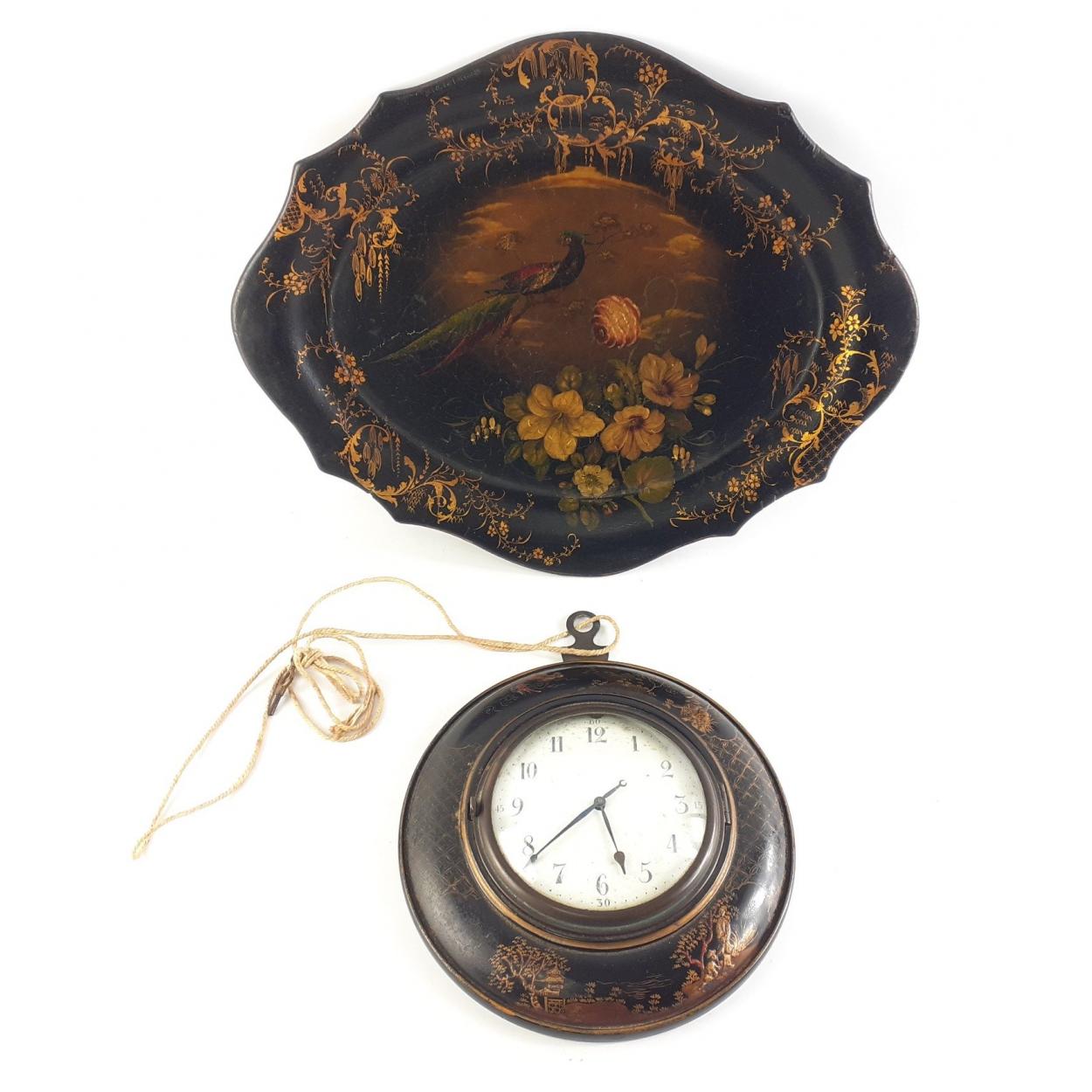 An antique wall hanging wooden clock (face approx 12cm ) with a papier mache tray (35cm length approx). Both black with gold, the tray features a peacock and the clock has an Oriental design