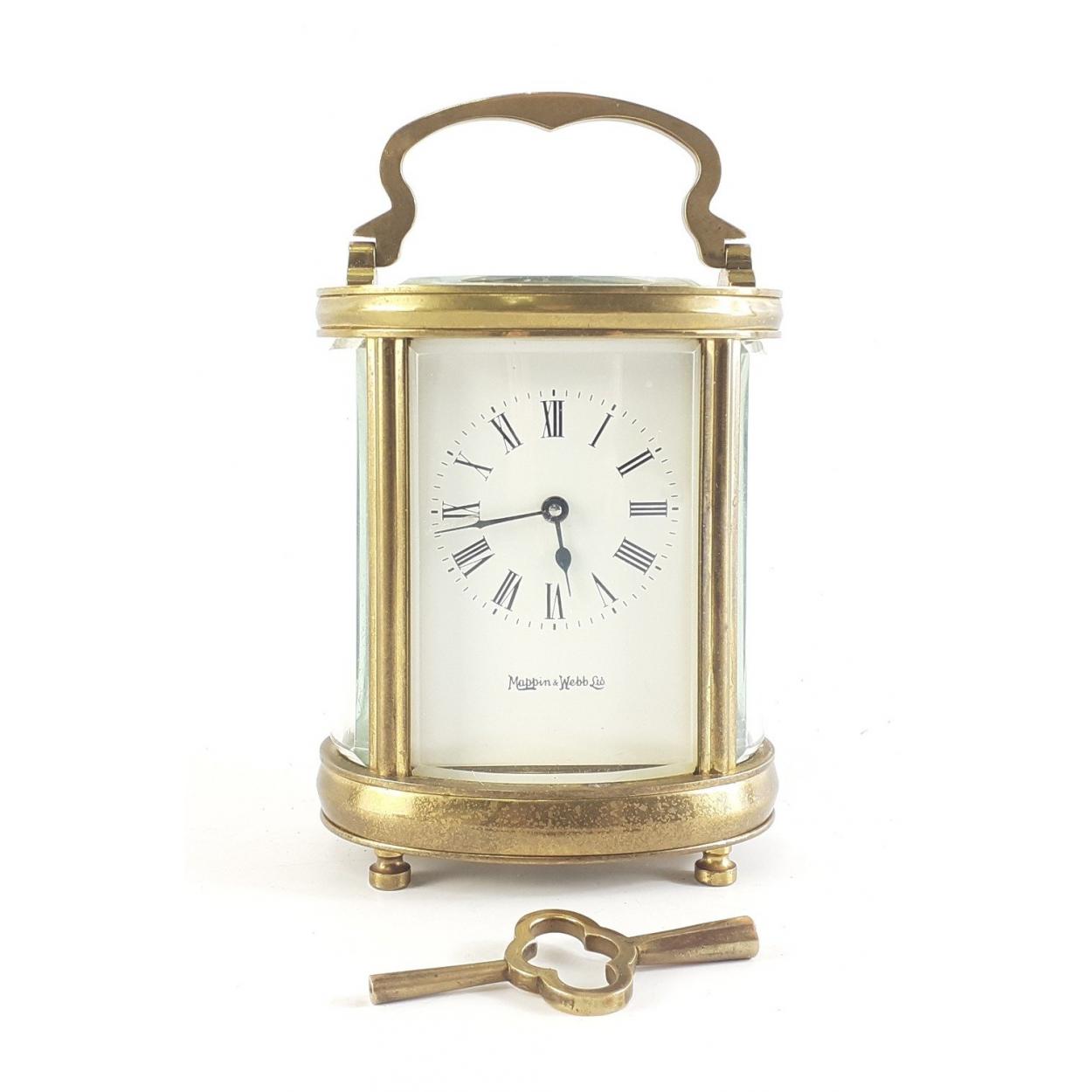 MAPPIN & WEBB heavy brass carriage clock standing 12cm and in original box with 1983 guarantee card, with key and appears to be working well with a gentle wind. Beautiful bevelled glass. The piece may benefit from a gentle clean but is in superb well cared for condition.