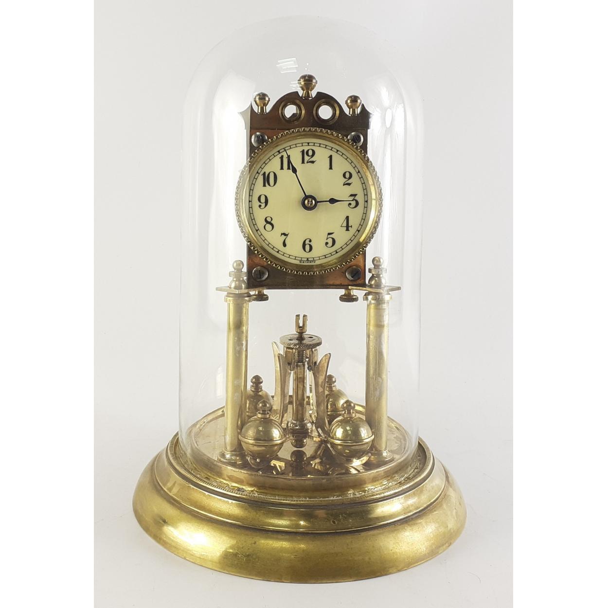 A glass domed German brass clock. A/F. In a state of disrepair but displays well. Dome has nibbles to base. Stands 28cm approx.