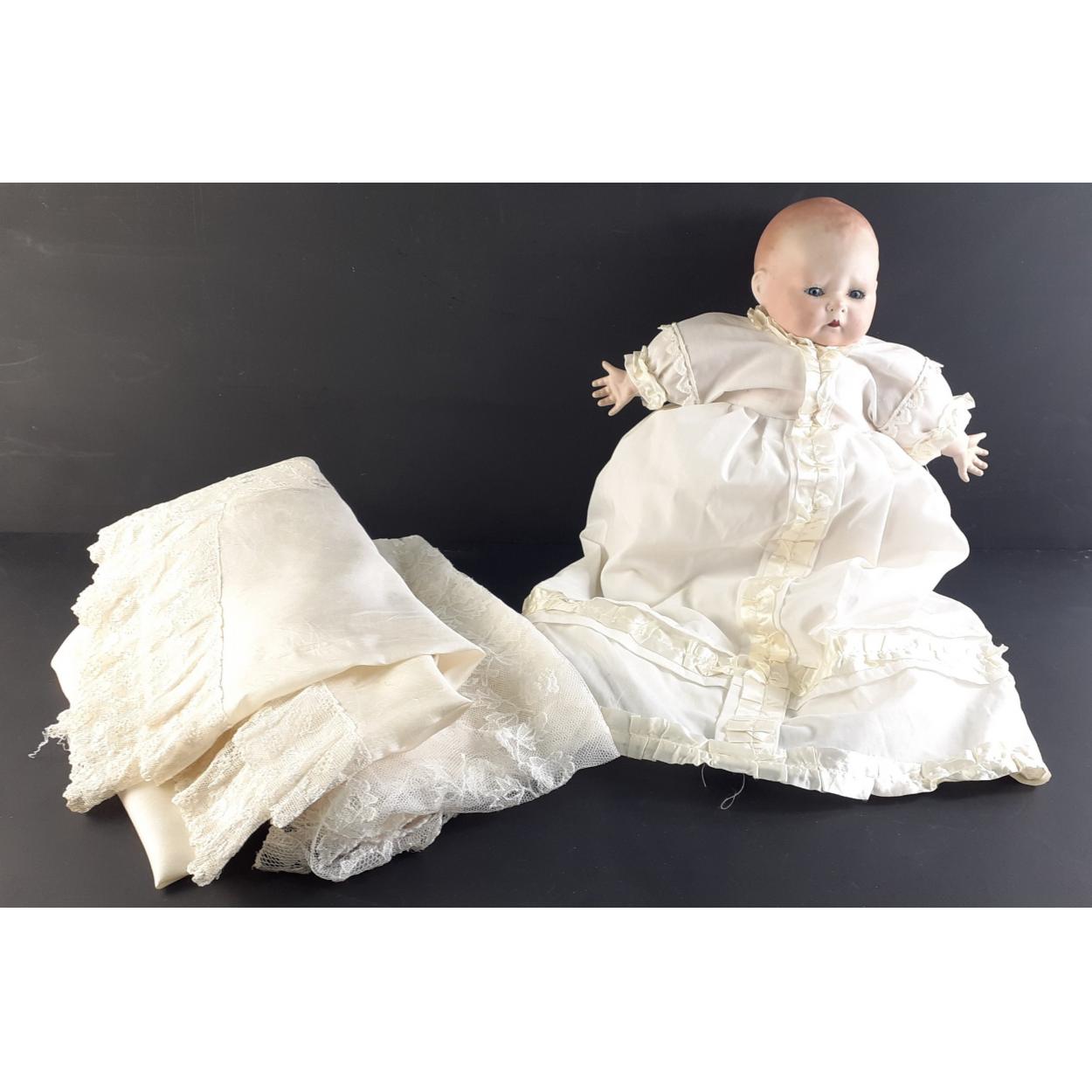 Bisque head doll with cloth body. Marks to rear of neck indistinct. 35cm approx. With two antique christening shawls.