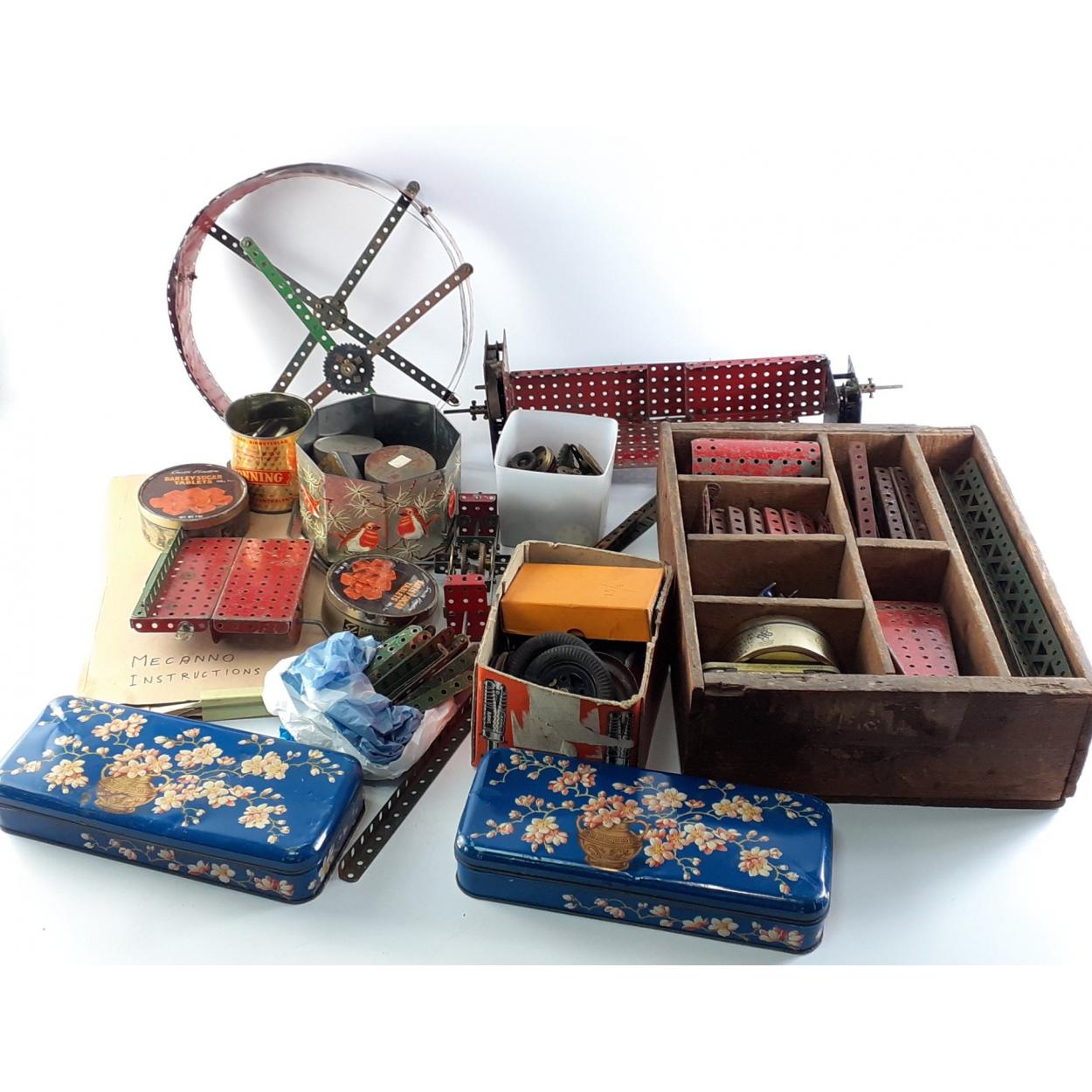 A collection of older green and red MECCANO including tins of fixings, wheels, and much, much more.