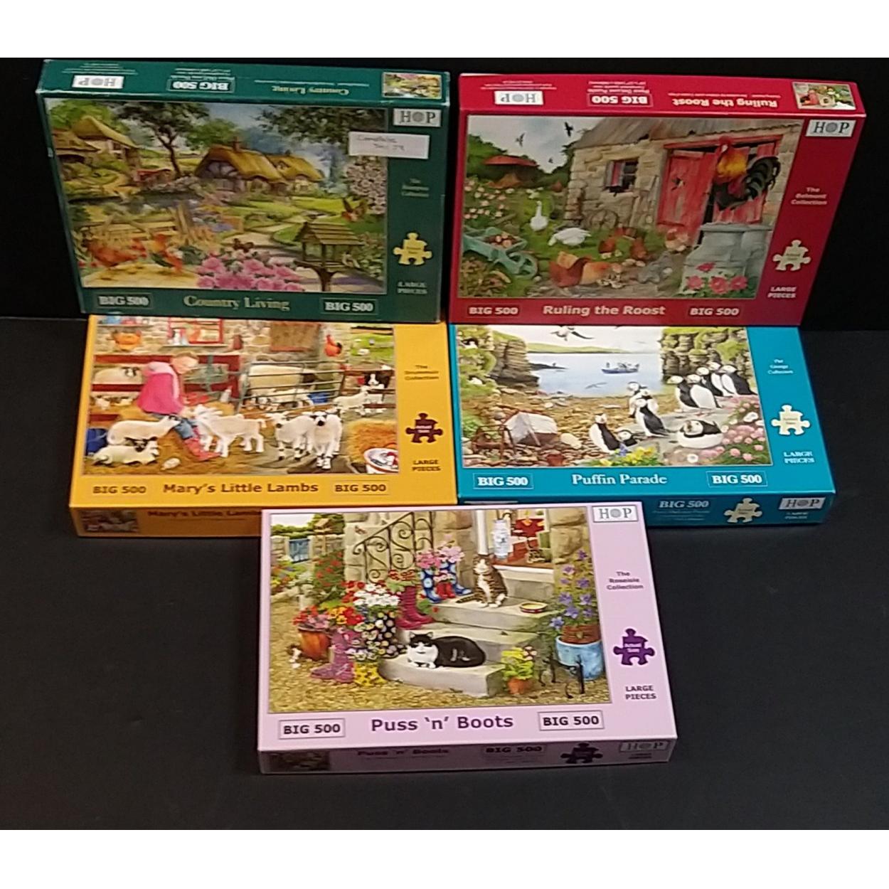Get ready for the long winter nights. JIGSAWS 500 piece x 5. Mary's Little Lamb, Puss in Boots, Ruling the Roost, Puffin Parade and Country Living. All jigsaws have been checked and are complete and in good condition.