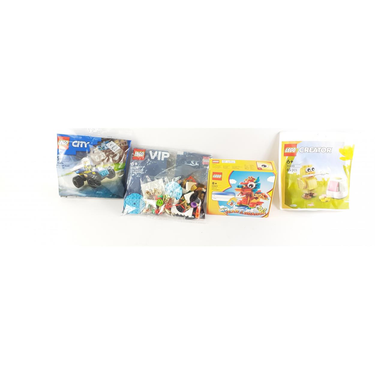 LEGO - Four various unopened sets, three in packets. 40611 Year of The Dragon, 30664 Police buggy, 30690 creator, 40605 Lunar New Year add on pack. Note the vendor built the models, dismantled carefully checked each piece and stapled the bags closed.