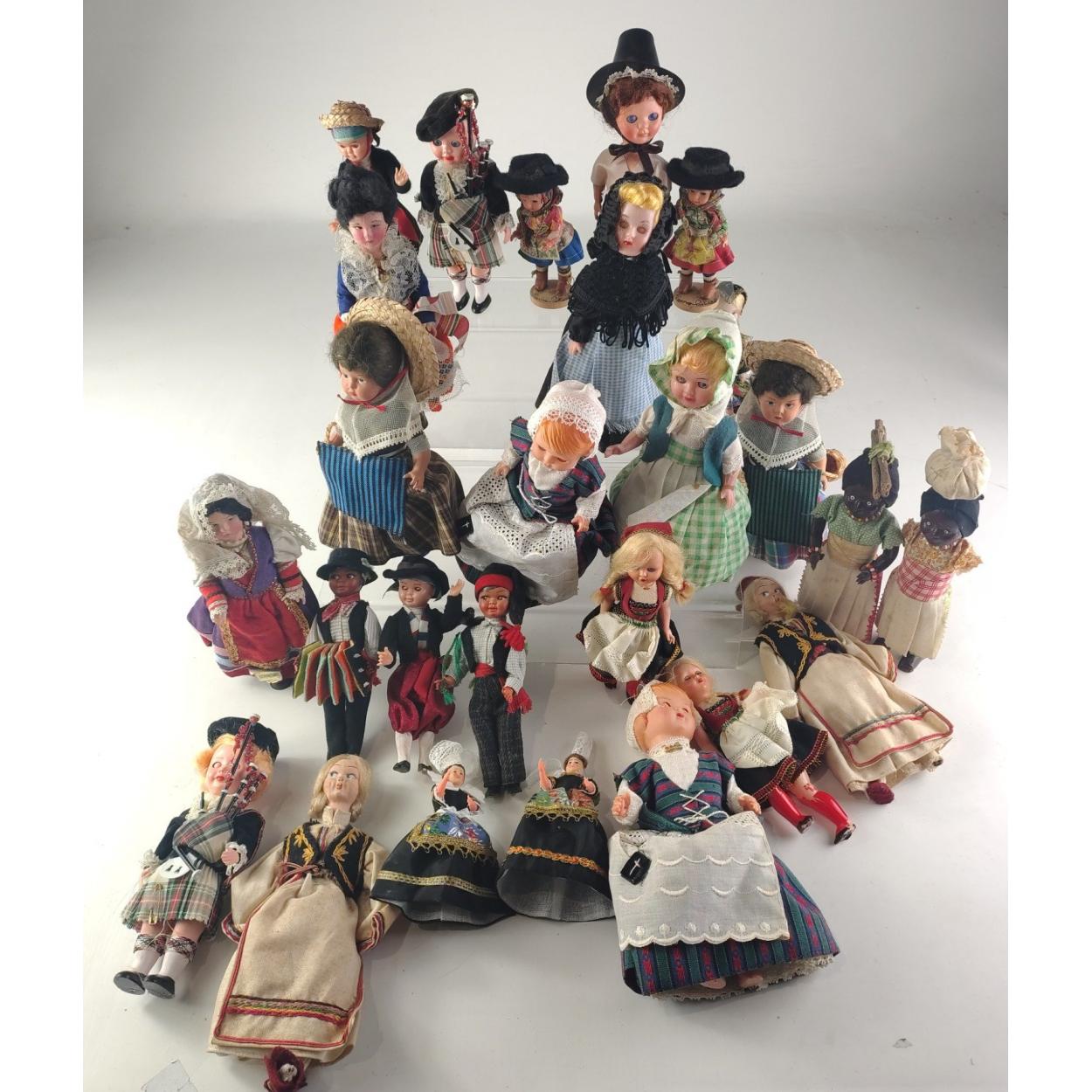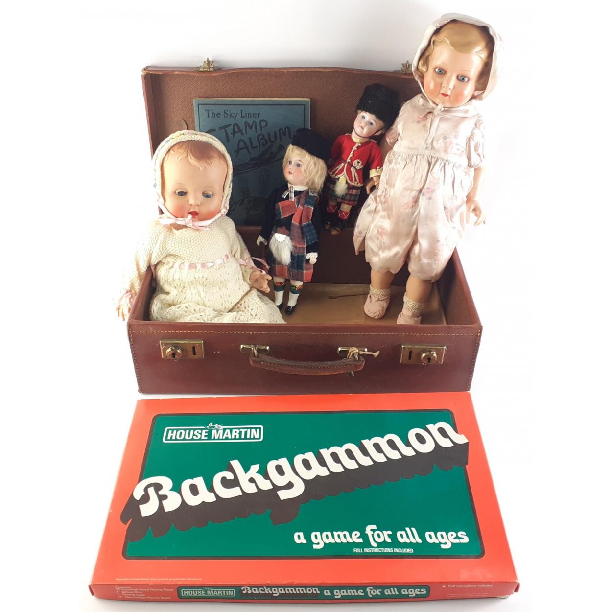 DOLLIES! A brown suitcase with dolls and two Scottish dress dolls, stamps, and also backgammon.