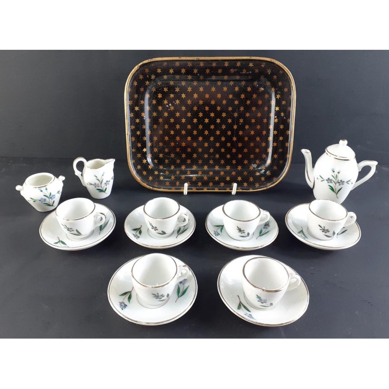 A pretty and cute small collection of miniature cups, saucers, tea service etc. A fun little set in good condition. Coffee pot, milk and sugar, six cups and saucers. The coffee pot is 7cm tall approx.
