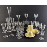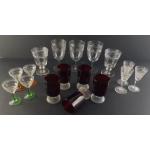 A selection of quality older glassware. Four coloured stems, 5 French cranberry glass and a selection of etched glasses.