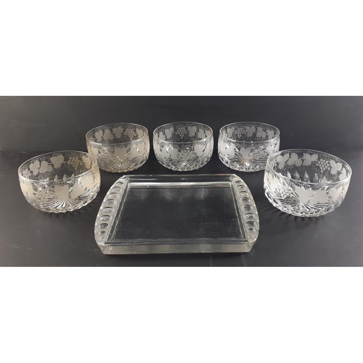 Five lovely crystal finger bowls with etched design of vines and grapes, (12.5cm diameter approx) plus a heavyweight glass tray 26 x 21cm approx with inset marble effect.