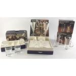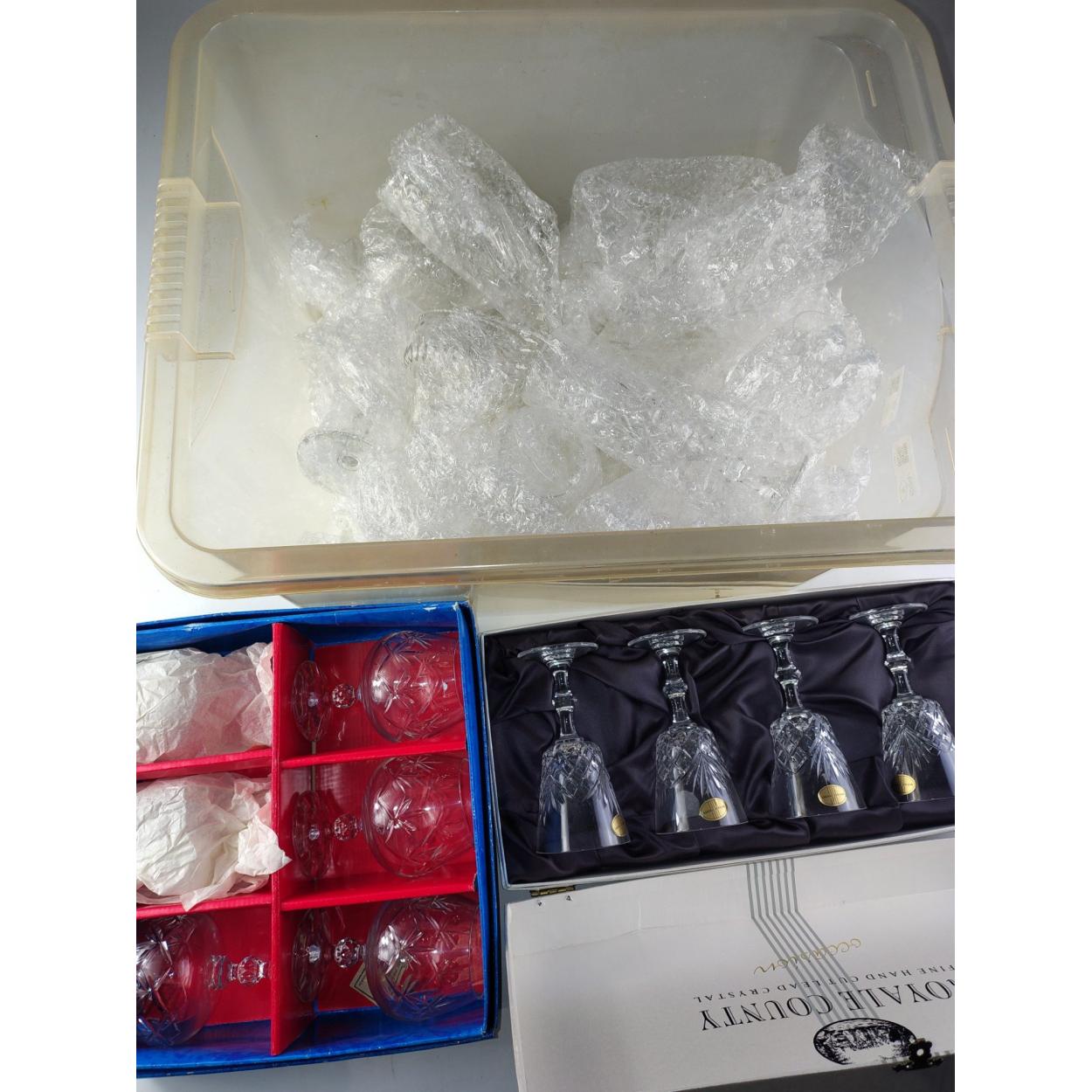 A good quantity of glassware to include champagne flutes, champagne saucers, including a boxed set of small brandy glasses, and a boxed set of ROYAL COUNTY wine glasses