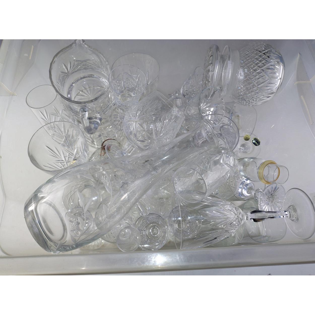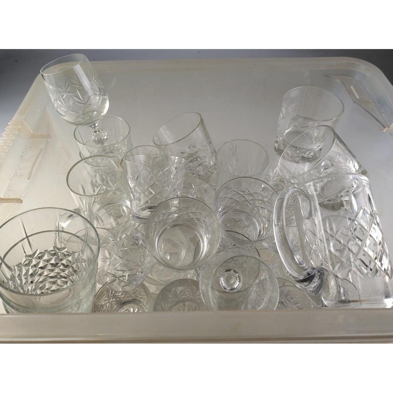 A good selection of crystal and glassware to include tumblers, wine glasses, carafe, water jug
