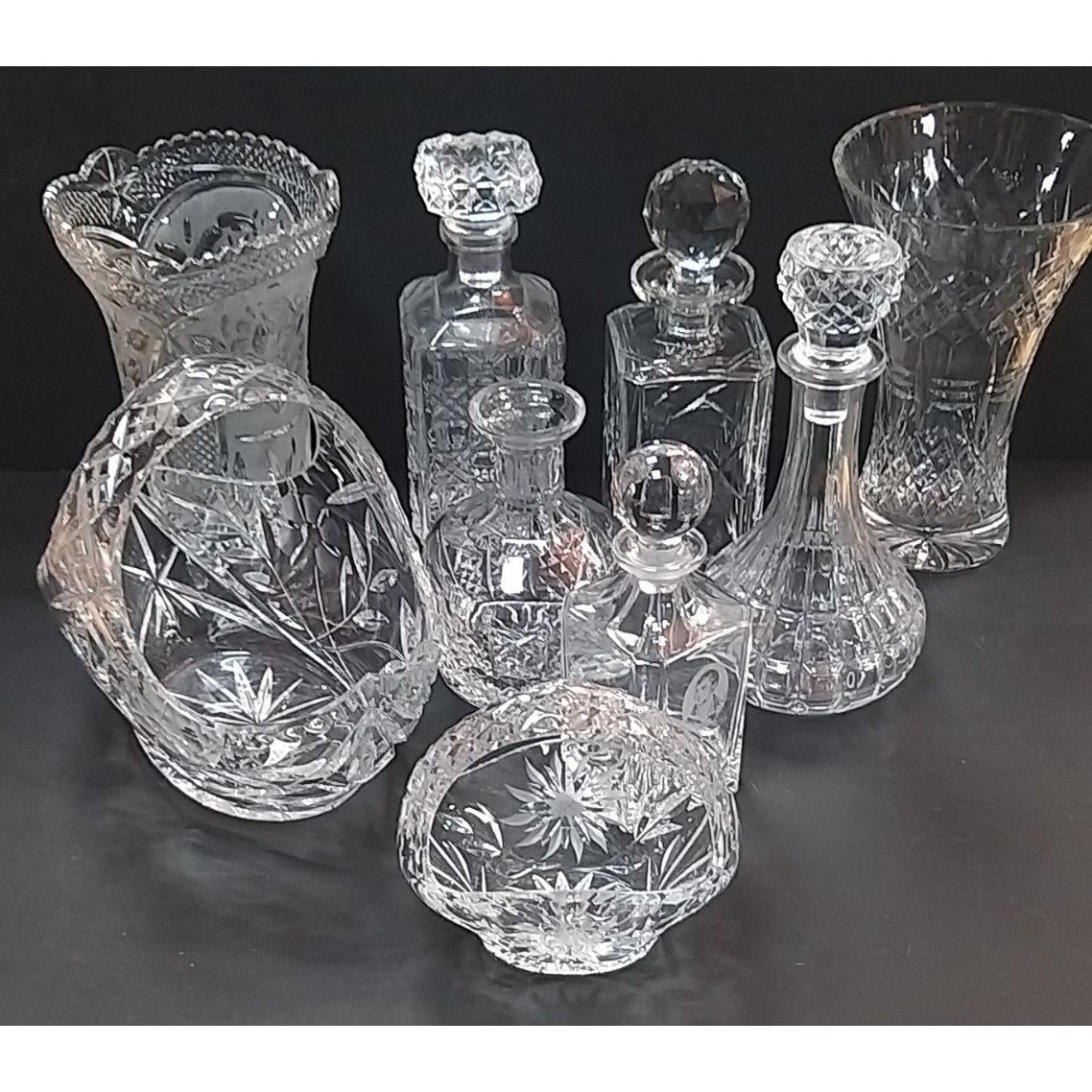 A collection of glassware to include 4 vases and 6 decanters (2 without stoppers)