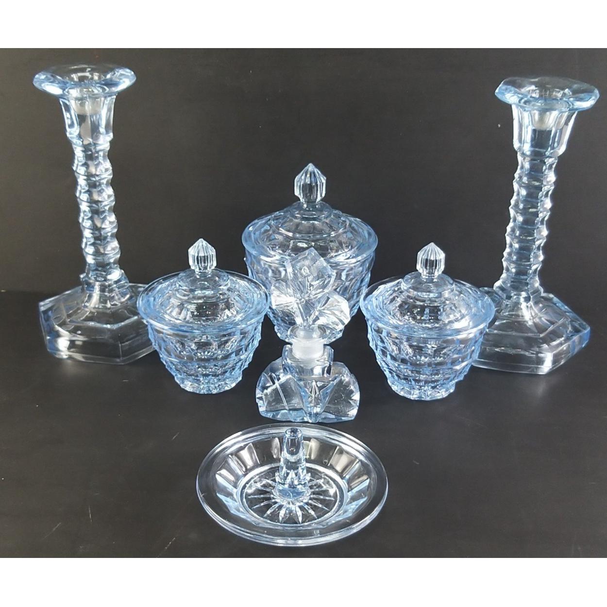 COOL BLUE! - A pressed blue glass dressing table set with candle sticks, pots, ring tray and a rather lovely scent bottle