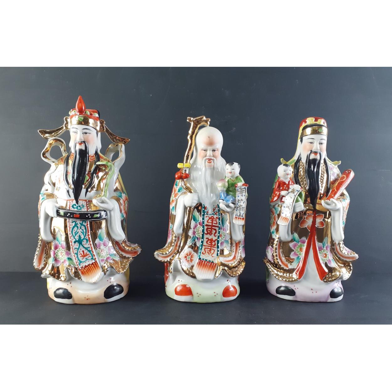 Three Japanese Gods / Immortals. The tallest 23cm approx. All in good undamaged condition.