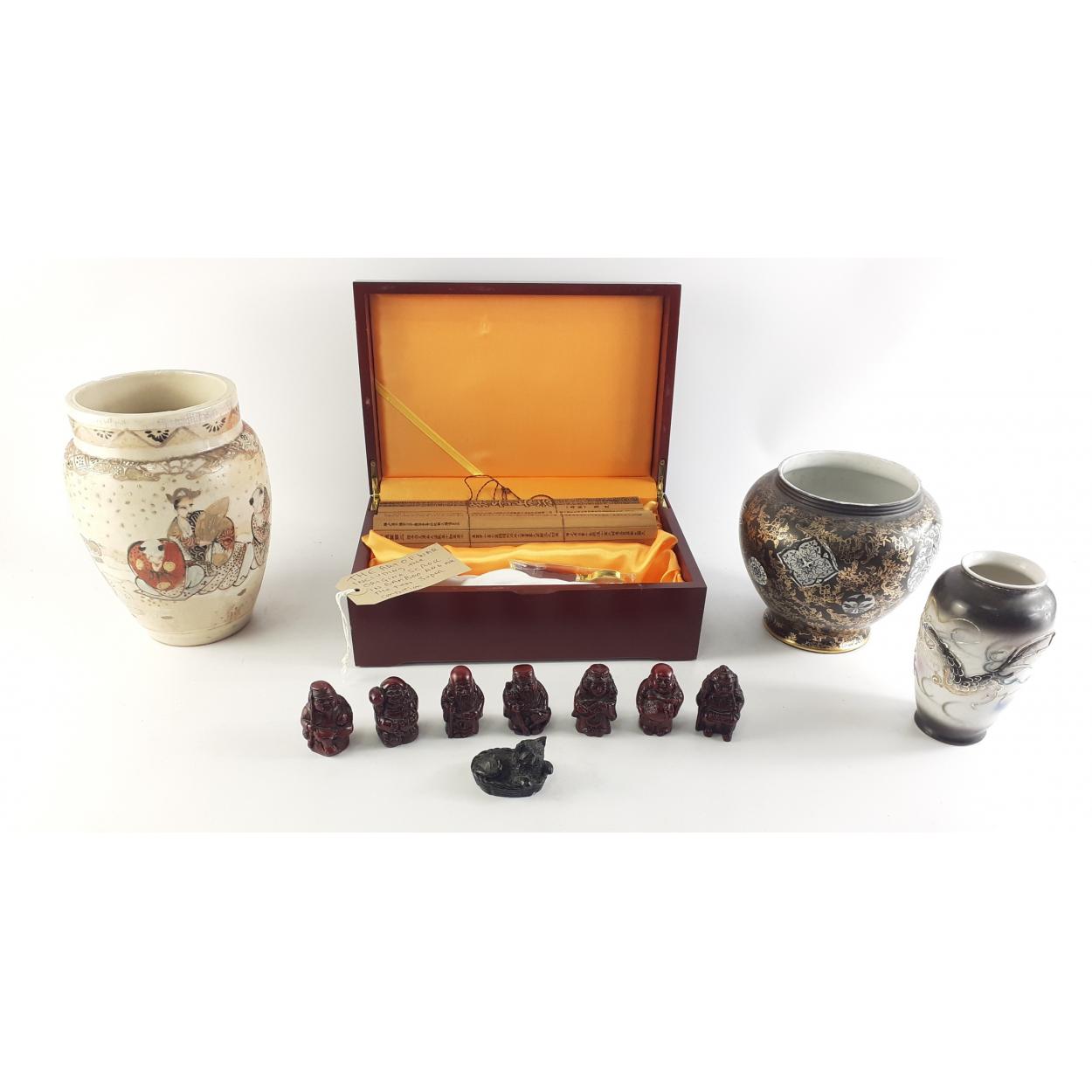 Interesting Oriental lot. A boxed bamboo scroll of THE ART OF WAR, with various small resin figures and three Oriental vases.