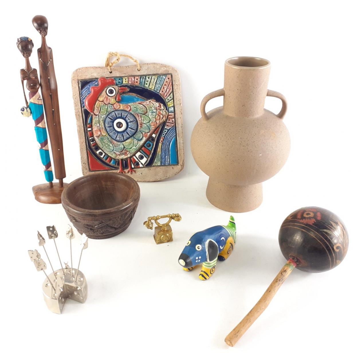 Small lot of TRIBAL interest. Maracas, painted dog, chicken wall plaque etc.