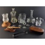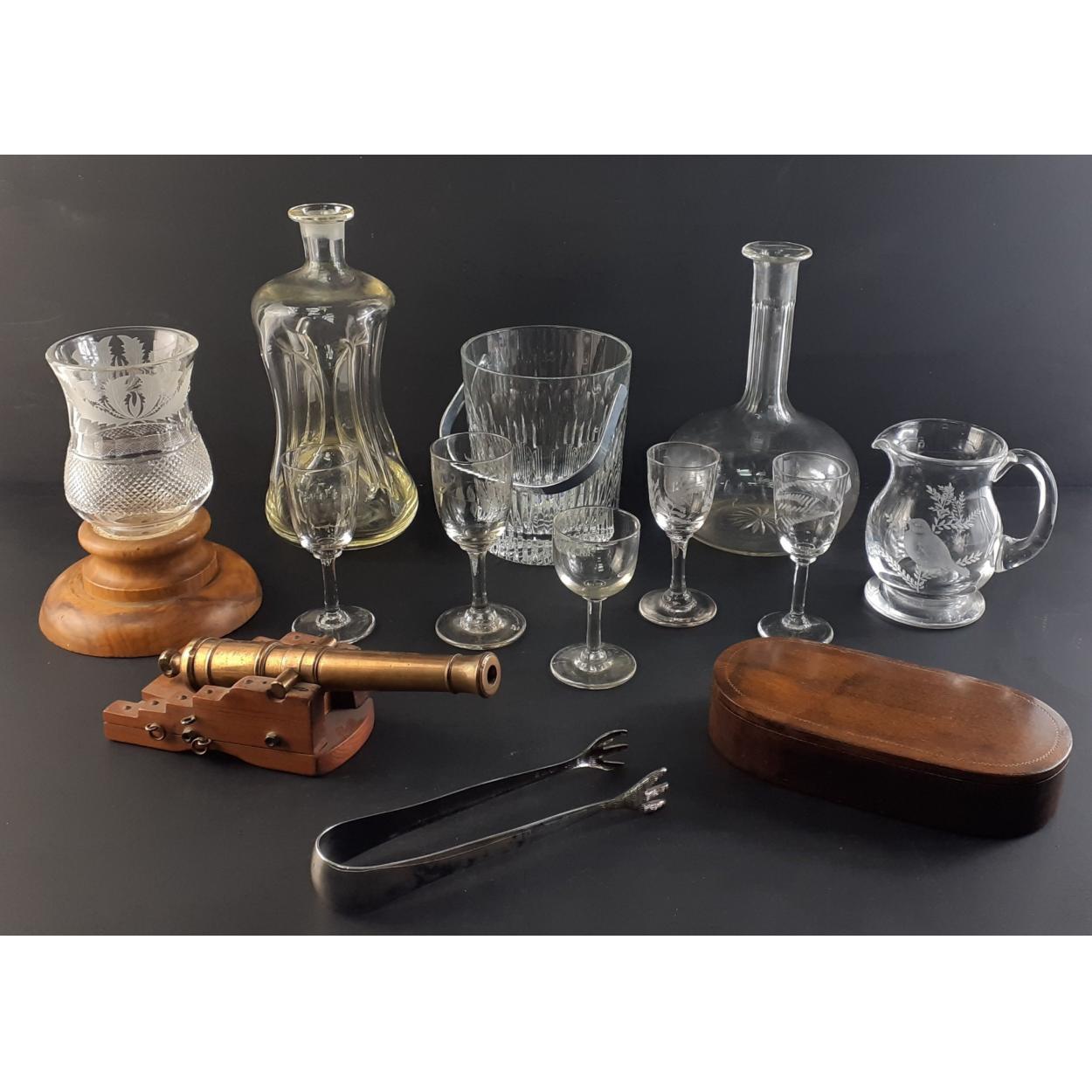 Mixed lot to include attractive THISTLE glass candle holder on stand, decanters, glasses, wooden box and a rather nice small brass cannon.