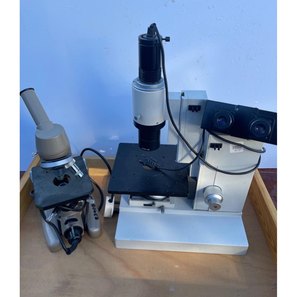 Peebles High School fund raising - A large science dept research microscope by LEITZ DIAVERT - 45cm high approx with also a smaller VICKERS INSTRUMENTS microscope