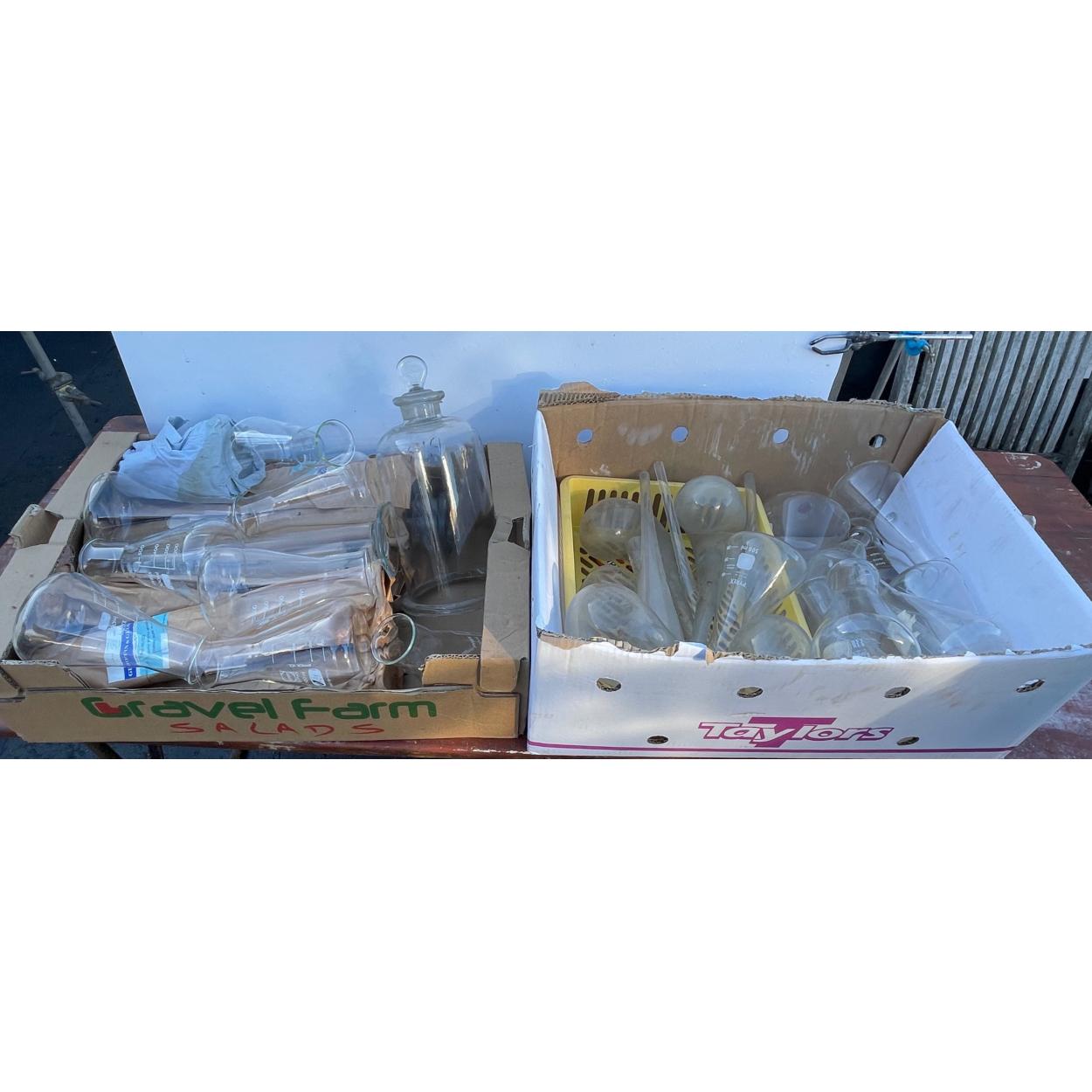 Peebles High School fund raising - two boxes of scientific glassware to include funnels, boiling flasks, various crucibles. Some unused.