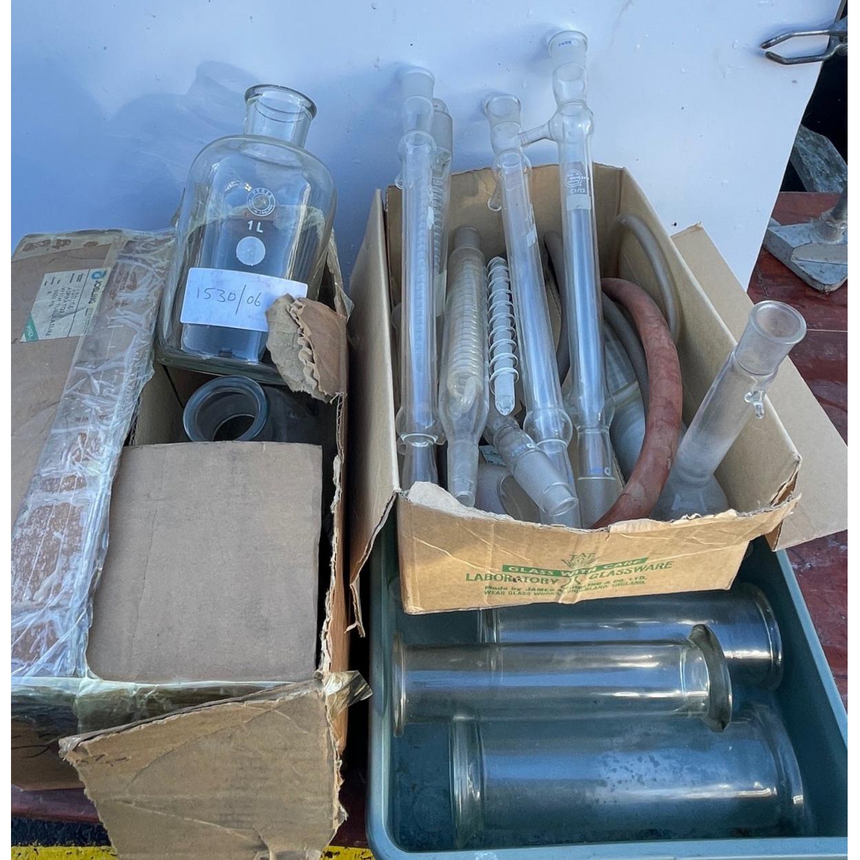 Peebles High School fund raising - Science dept - A mixed couple of boxes of science dept to include glass coil dispensers, glass cylinders and JOBLINE made aspirators with tubulature - as in new condition in their original box etc
