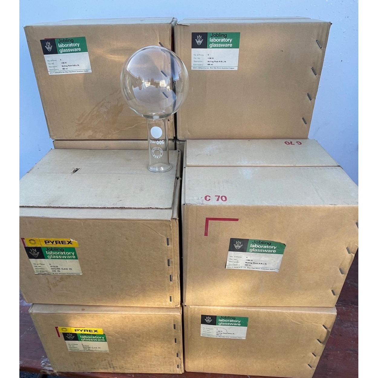 Peebles High School fund raising - A science dept laboratory two boxes of distillation flasks 500ml and 250ml - 6 in each box