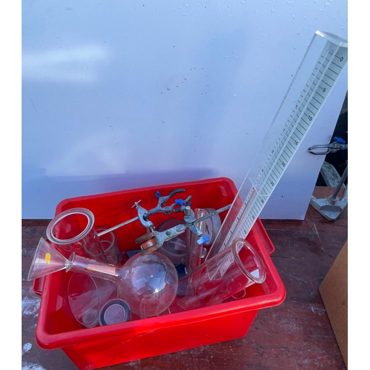 Peebles High School fund raising - Science dept mixed box of laboratory glassware to include two test tube clamp stands, funnels, PYREX ERLENMEYER flask ranging 500ml - a glass mortar and pestle and a BOYLES LAW apparatus etc