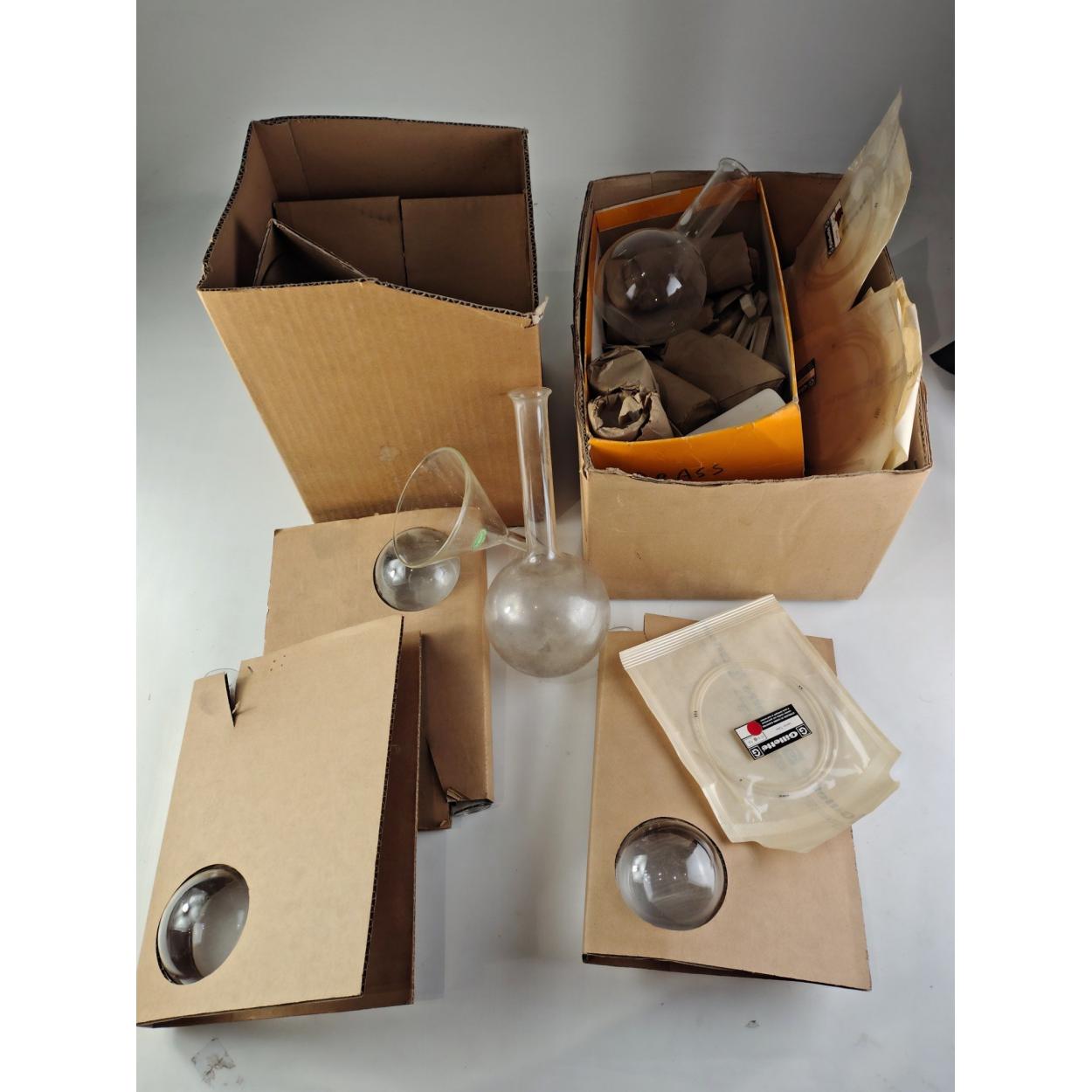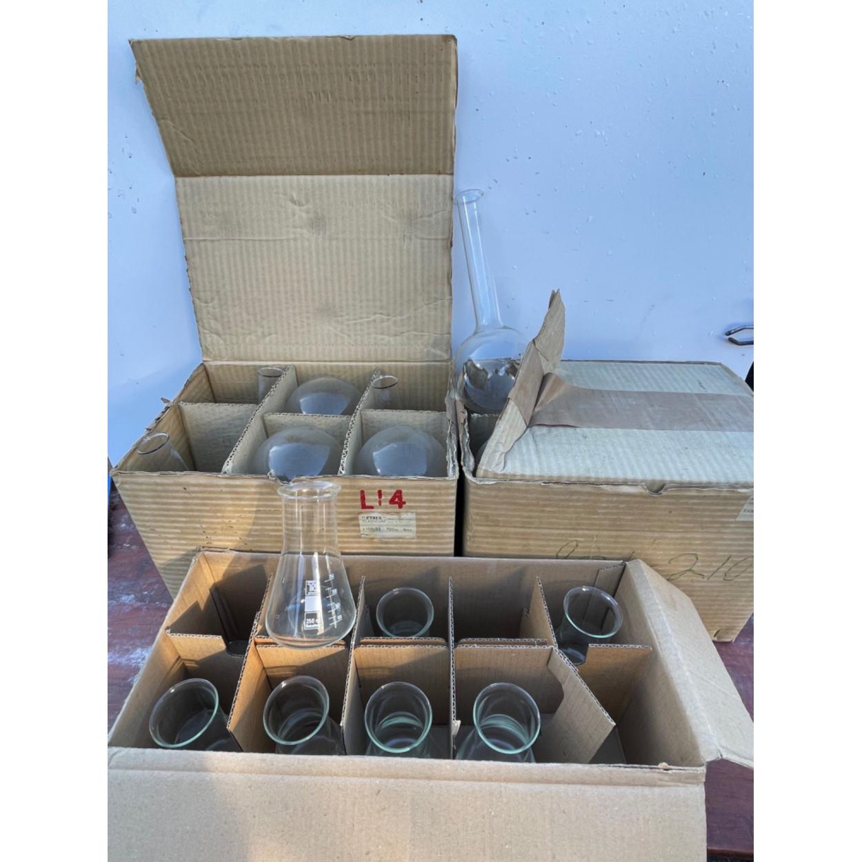 Peebles High School fund raising - A science dept laboratory 3 boxes with 250ml PYREX ERLENMEYER flasks, 2 boxes of 700ml long neck round globe bottom flasks