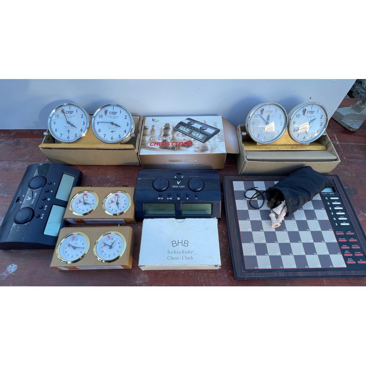 Peebles High School fund raising - Chess club clocks lot variety by LEAP & SUTTON COLDFIELD world chess specialist clocks -etc