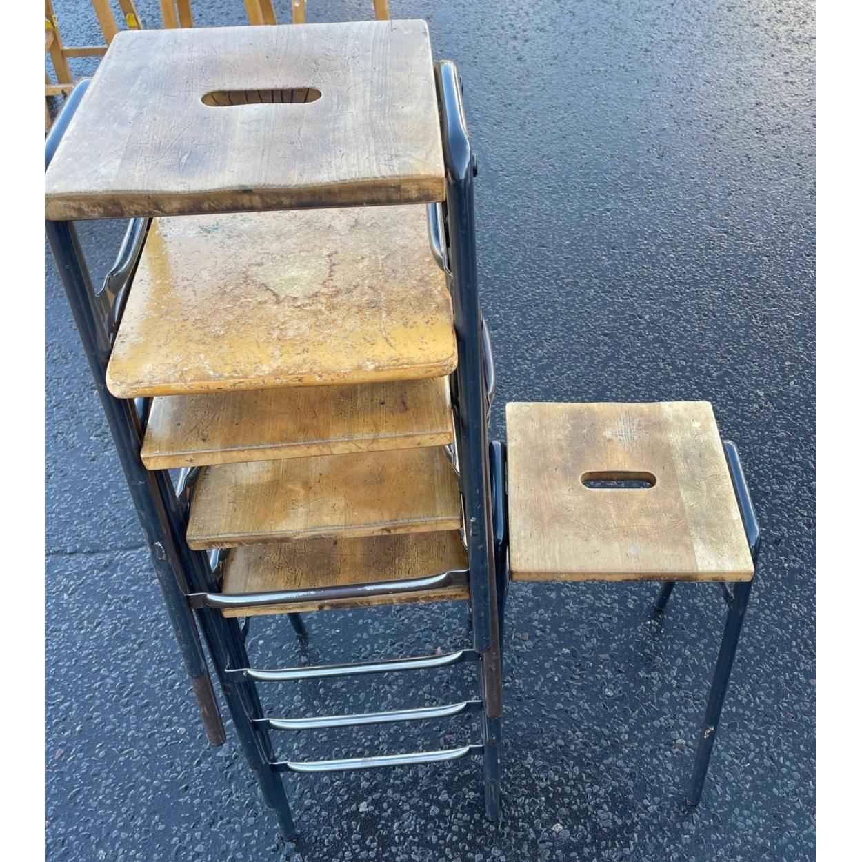 Peebles High School fund raising - VINTAGE RETRO c70's reclaimed ex-school stacking stools x 9 quantity - height 61cm x depth 32cm x width 42cm approx