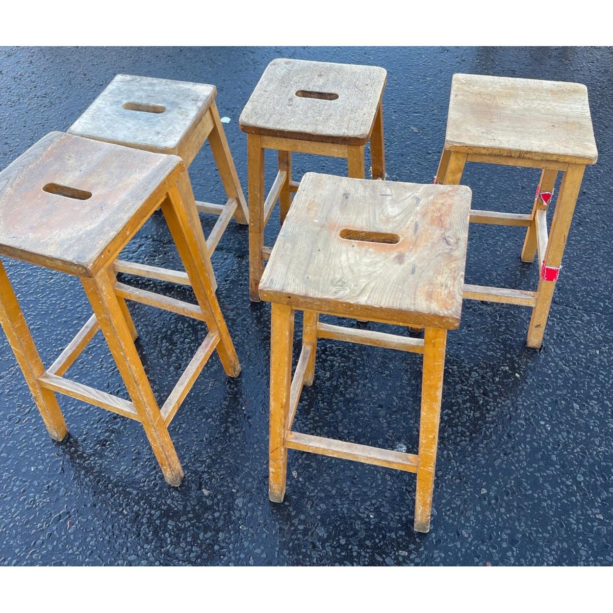 Peebles High School fund raising - A science dept VINTAGE FRENCH RETRO c1960/70's reclaimed ex-school stools x5 quantity - just FABULOUS PATINA! - dimensions all 36cm square x heights vary 50-68cm approx