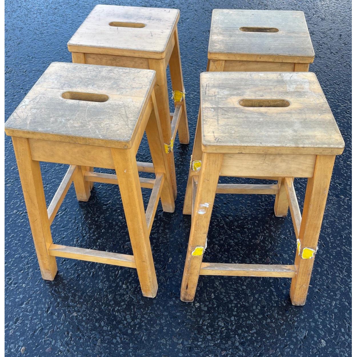 Peebles High School fund raising - A science dept VINTAGE FRENCH RETRO c1960/70's reclaimed ex-school stools x4 quantity - just FABULOUS PATINA! - dimensions 60cm height x 38cm width/depth