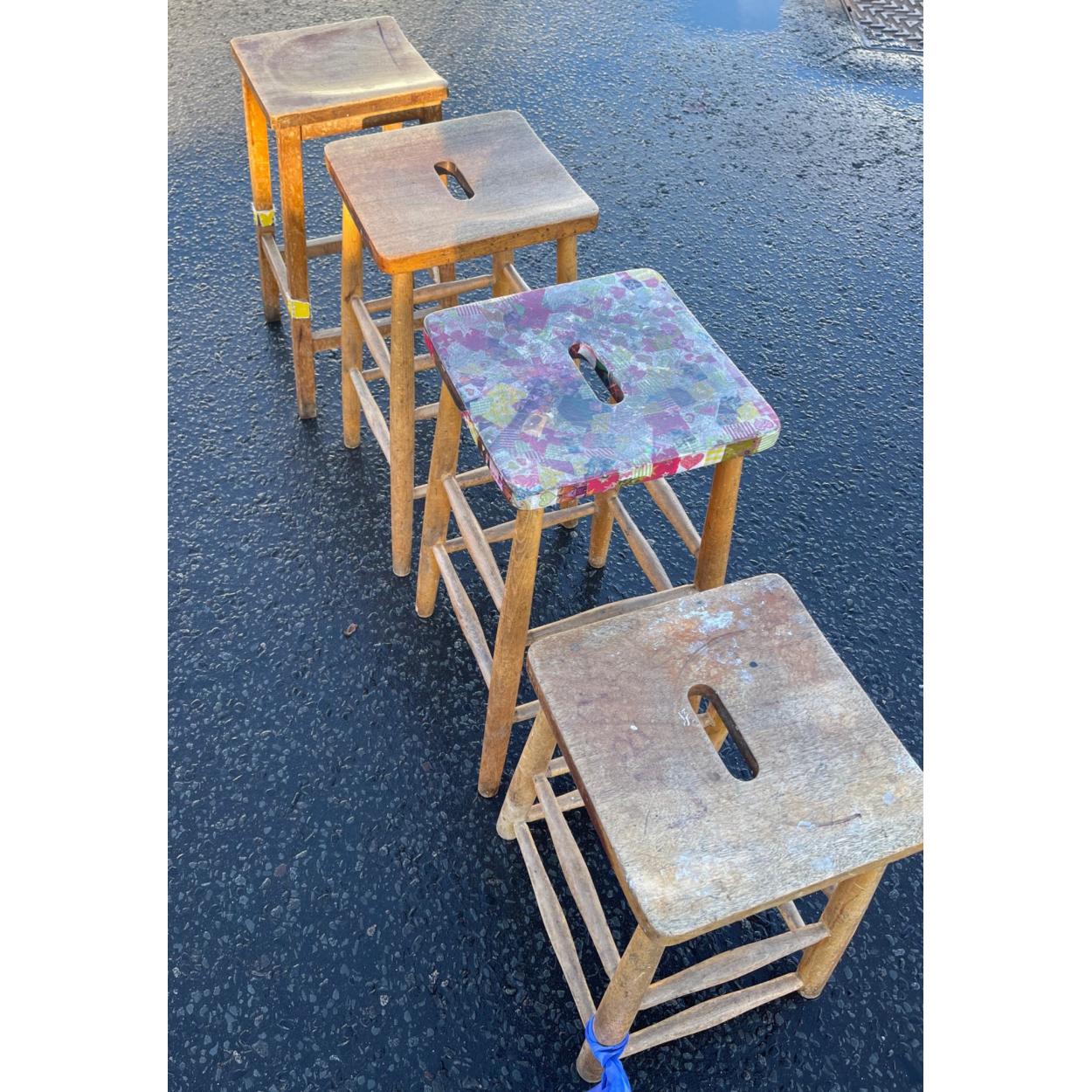 Peebles High School fund raising - Art dept VINTAGE FRENCH RETRO c1960/70's reclaimed ex-school stacking stools x 4 quantity - just FABULOUS PATINA! - dimensions 48-60cm height x 34cm - 3 with carry handles and one without