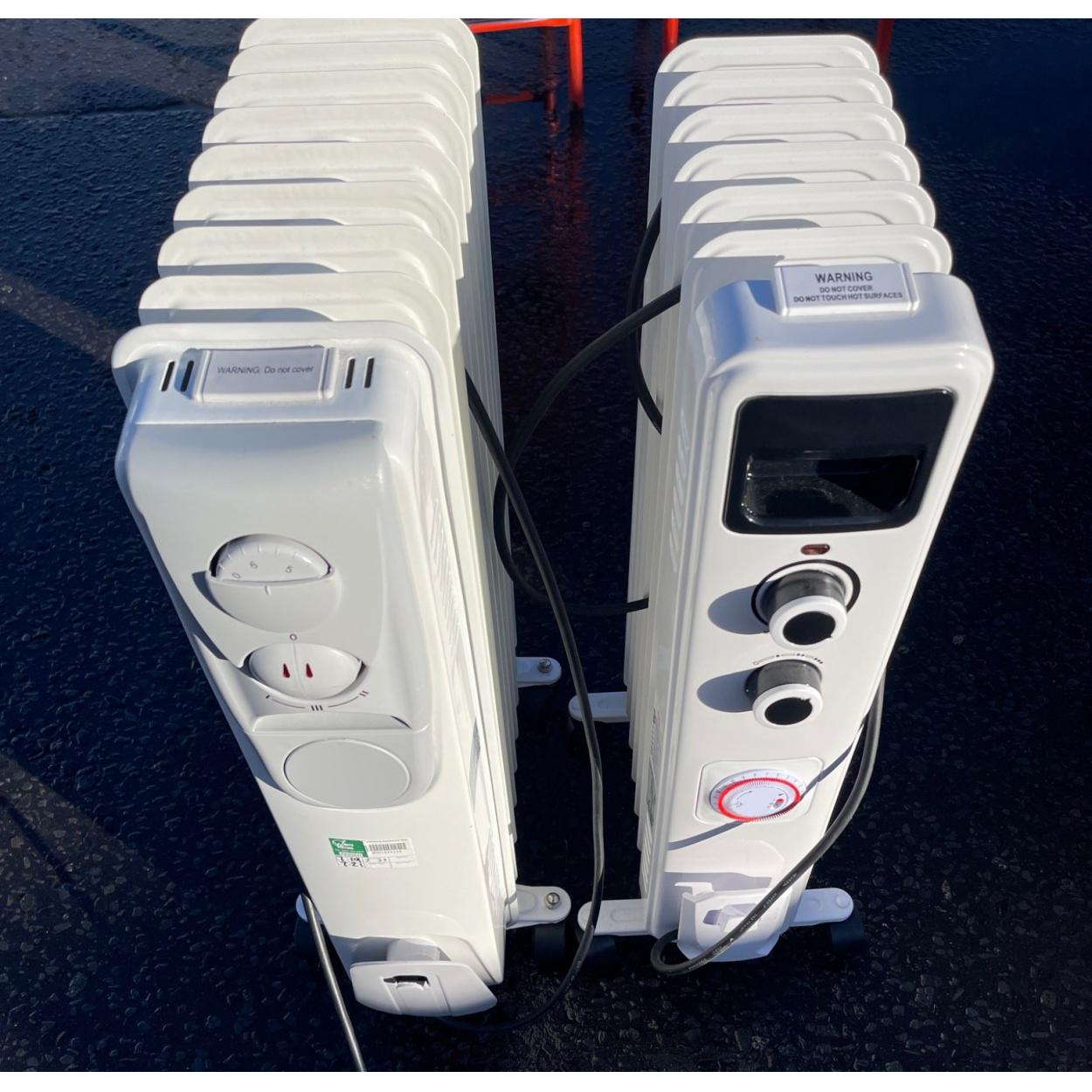 Peebles High School fund raising - KINGFISHER & ETERNA makes of oil filled style electric radiators x2 qty - both on castores - both 64cm height x 15cm width x 30cm and 40cm long approx