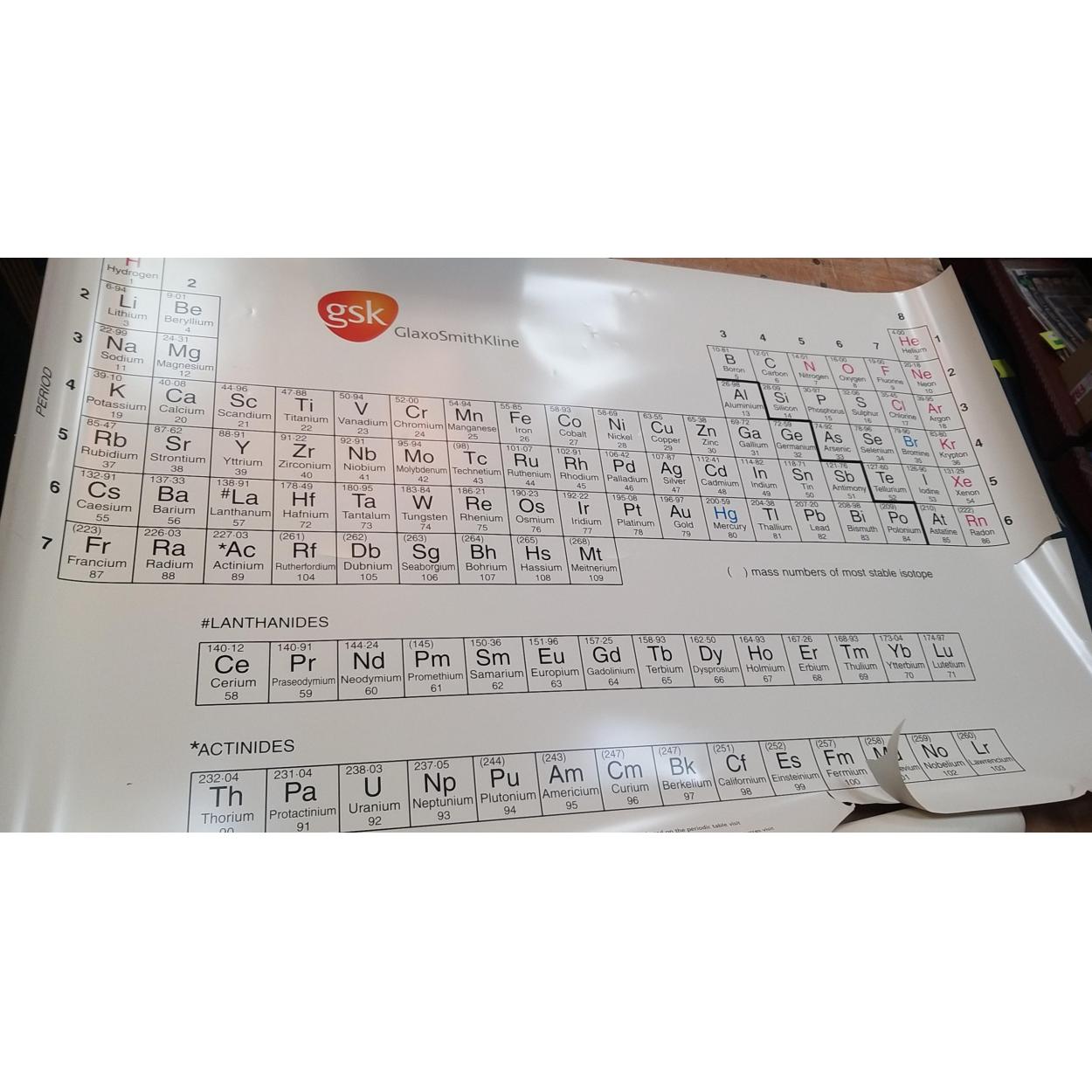 Peebles High School fund raising - large SKE PERIODIC table wall poster - the poster is damaged in some edge areas - but will look GREAT! once on the wall - dimensions 160cm x 105cm - CAN YOU RECITE THIS TABLE LIKE DANIEL RADCLIFFE (Harry Potter) once did on The Graham Norton Show:) - held in a brown poster tube