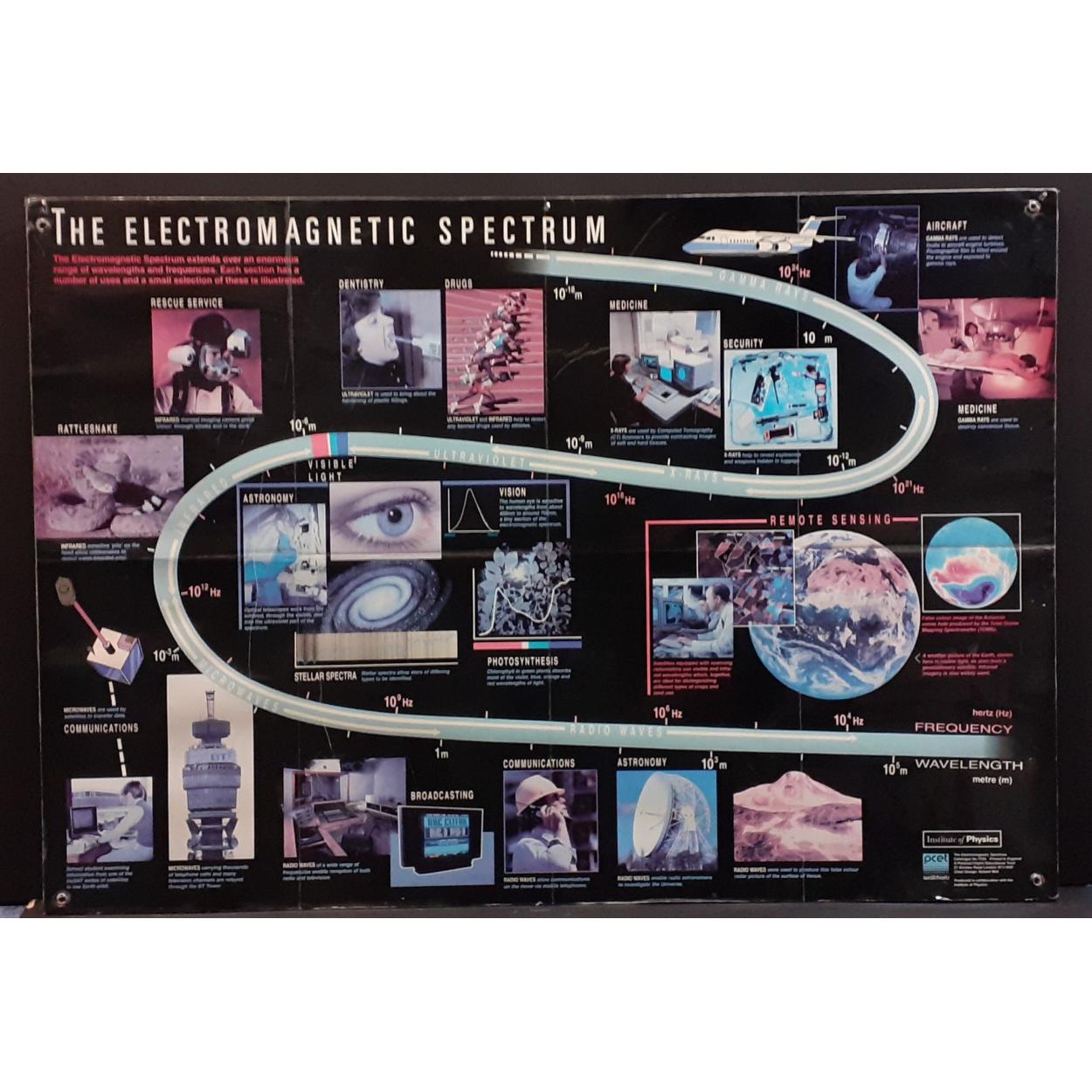 Peebles High School fund raising - a large poster explaining THE ELECTROMAGNETIC SPECTRUM on hardboard back. 100 x 70cm approx